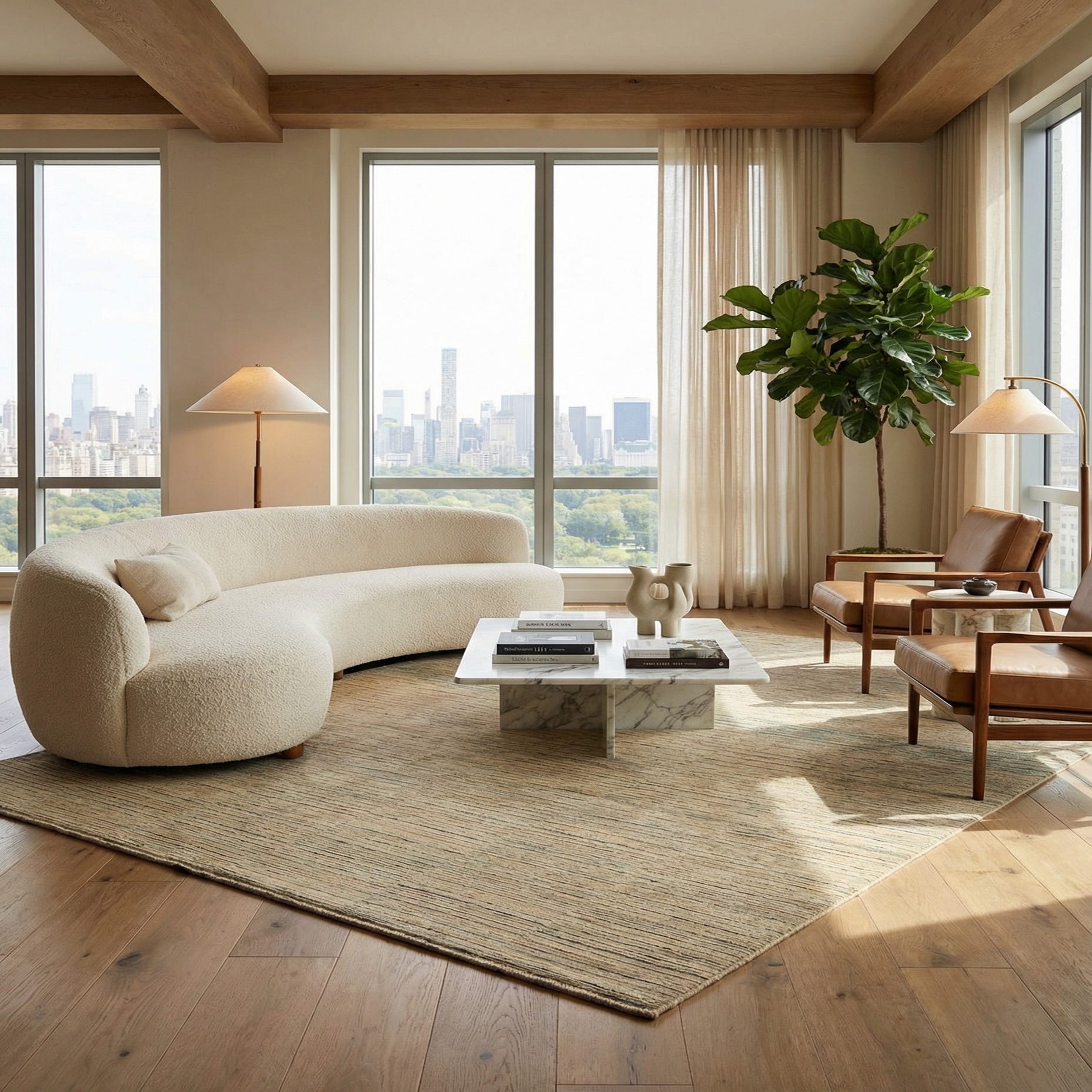 An 8x11 rectangular Modern Ziegler rug in ivory and cream with subtle horizontal stripes, perfect for a living room.
