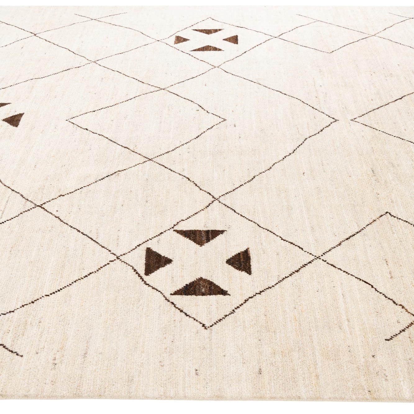 An 8x11 rectangular ivory wool shag rug with a modern tribal pattern of dark brown diamonds and geometric shapes.