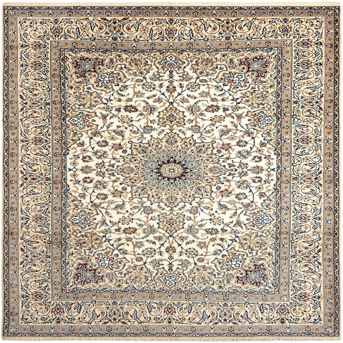 This Nain Collection rug is a handcrafted 8x11 piece, traditionally designed with a luxurious blend of wool and silk that offers a sophisticated sheen and a plush, comforting texture. The rug showcases a cream background that elegantly supports the elaborate floral and vine patterns, detailed with a palette that includes navy, sky blue, rusty red, and accents of taupe and beige, imparting a sense of depth and intricate artistry.