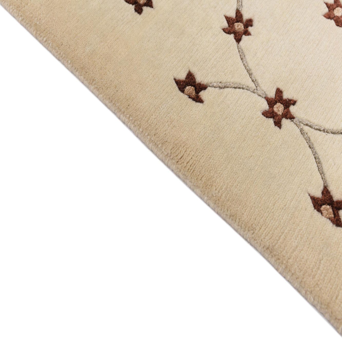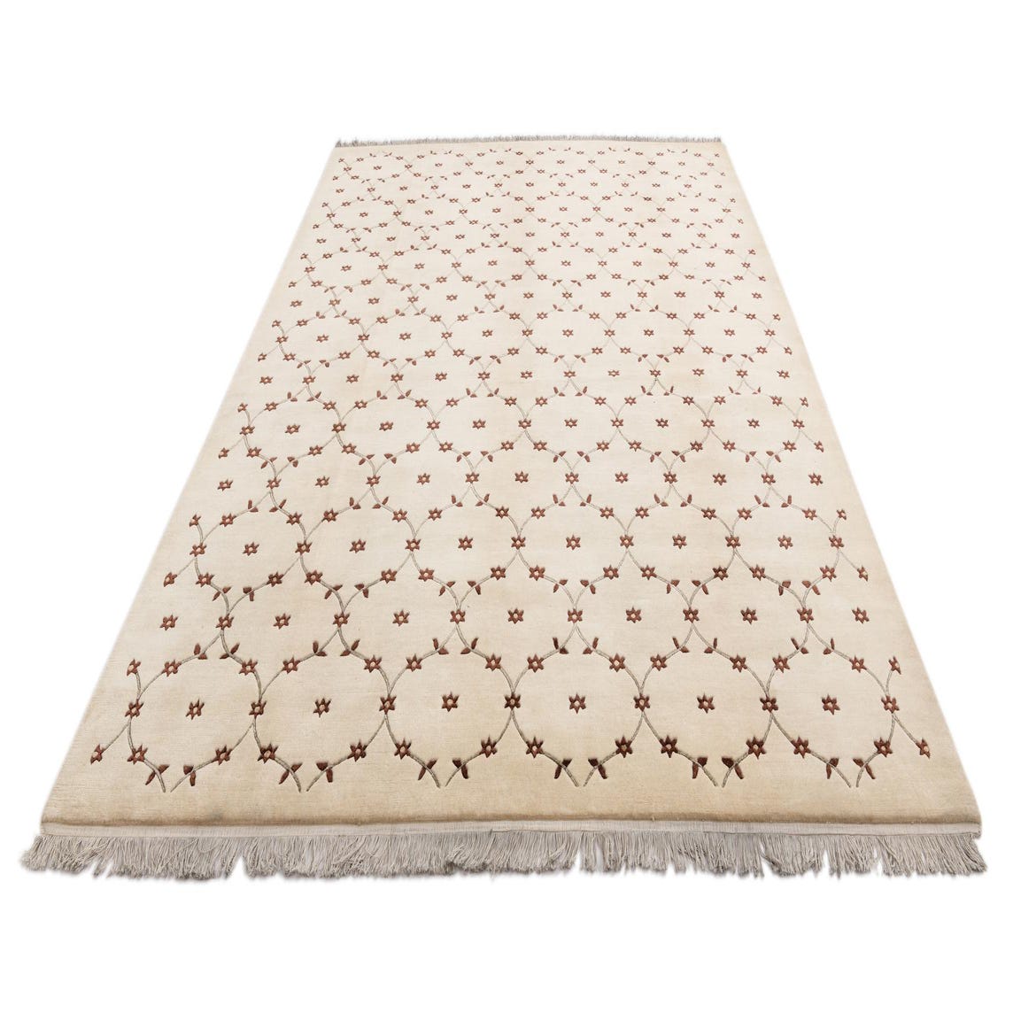 An 8x12 rectangular ivory wool rug with a repeating modern oriental pattern of interconnected circles and small red floral motifs.