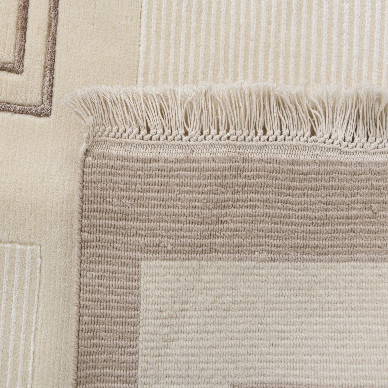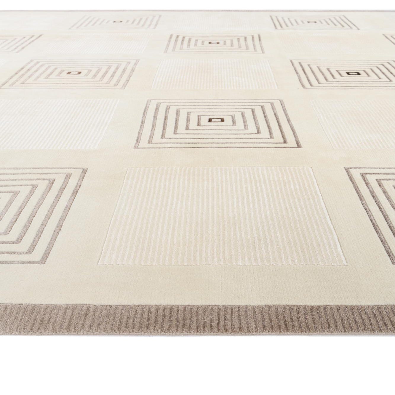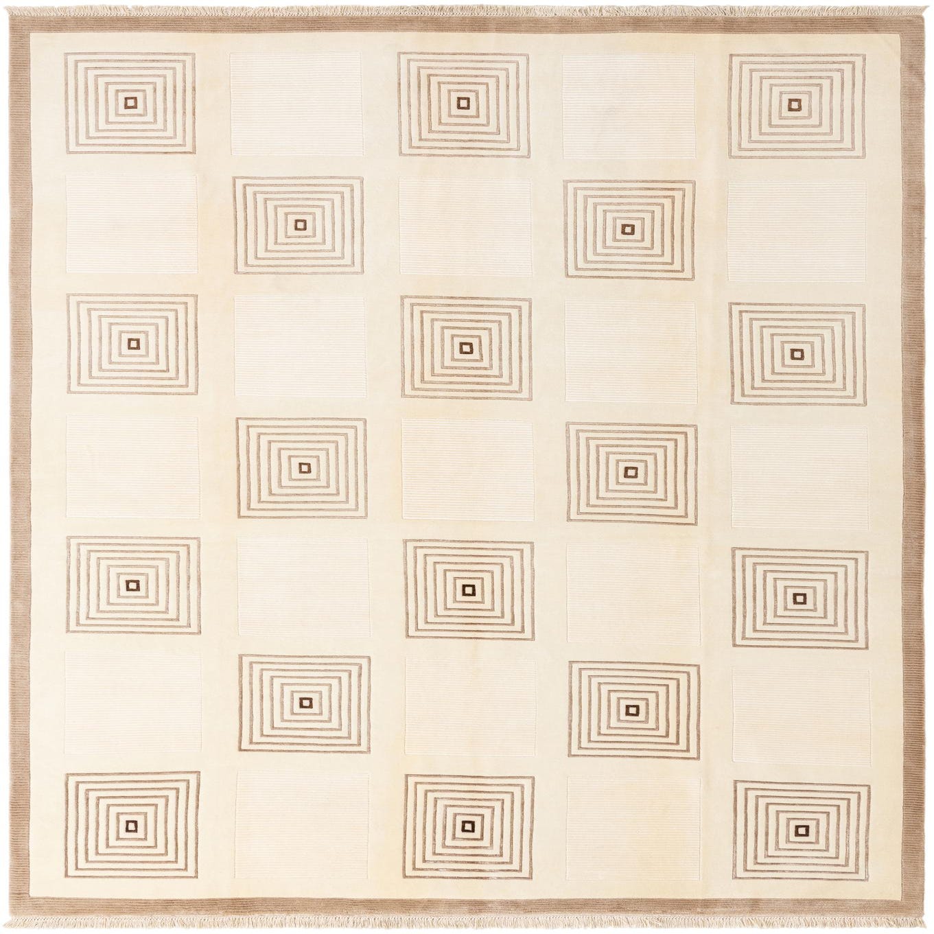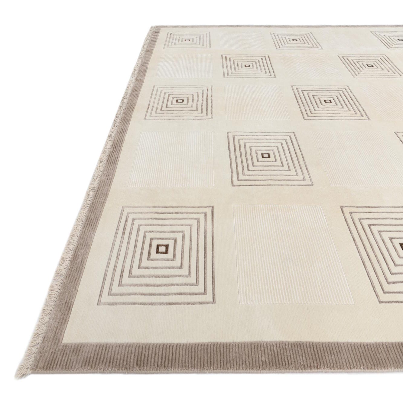 An 8x12 rectangular ivory wool rug with a modern oriental pattern of alternating solid and concentric square designs, framed by a subtle border.