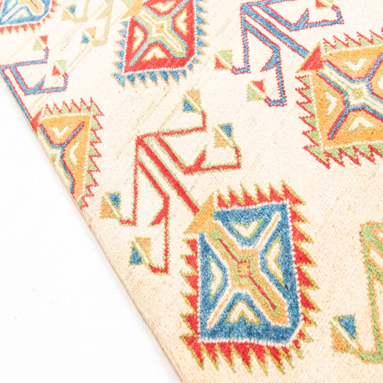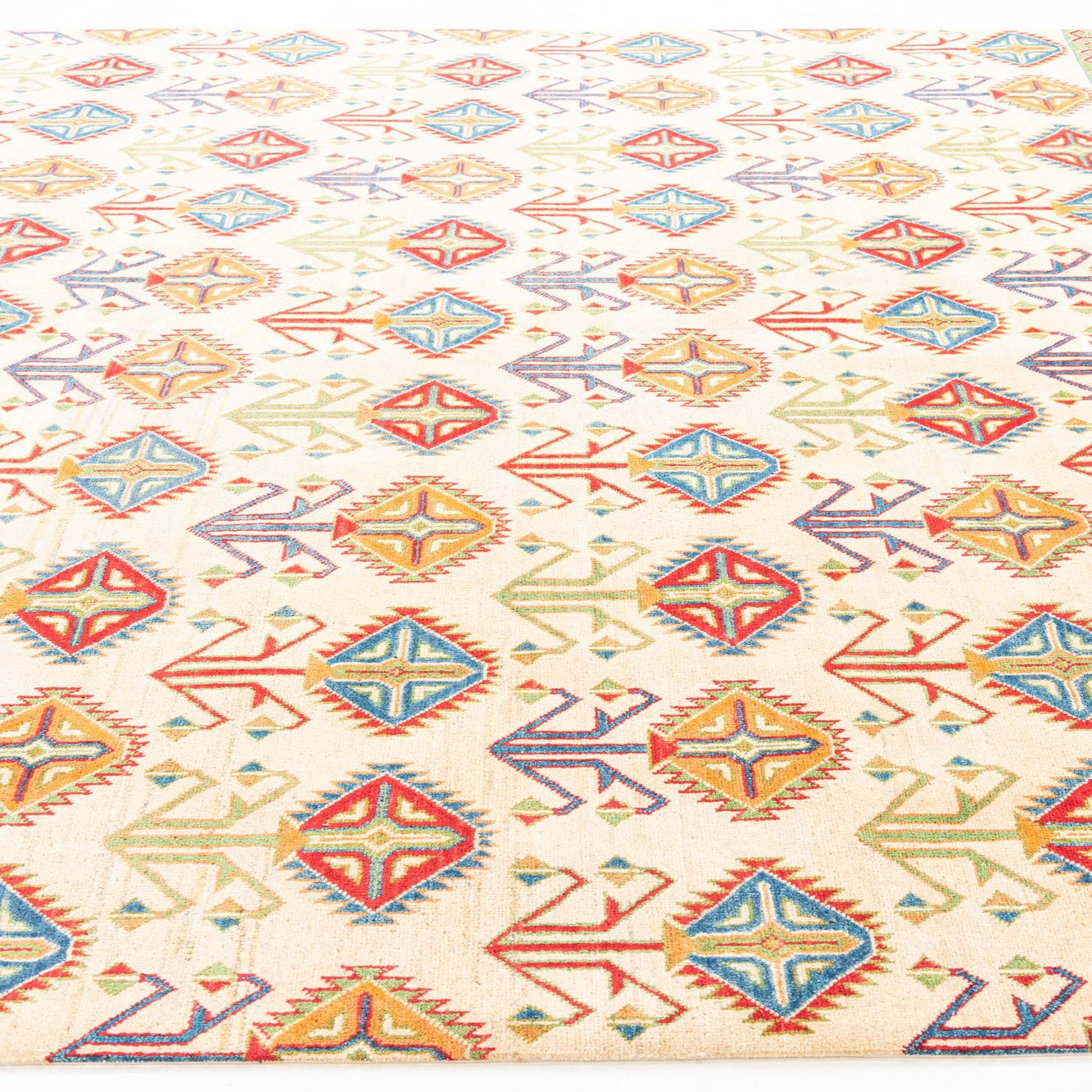This Kazak collection rug, measuring 8x12, is hand-knotted of 100% hand-spun wool, offering a dense and plush texture underfoot. The design features a traditional geometric pattern that includes stylized motifs and interlocking forms. The primary background color is a soothing cream, which elegantly supports the vibrant palette of blue, red, yellow, and navy blue accents.
