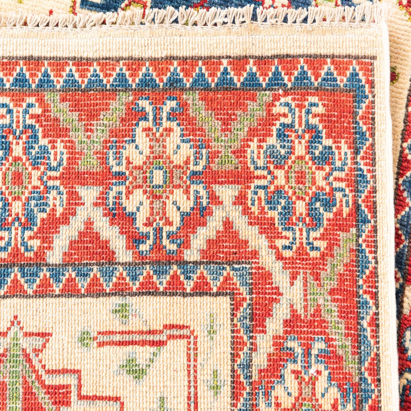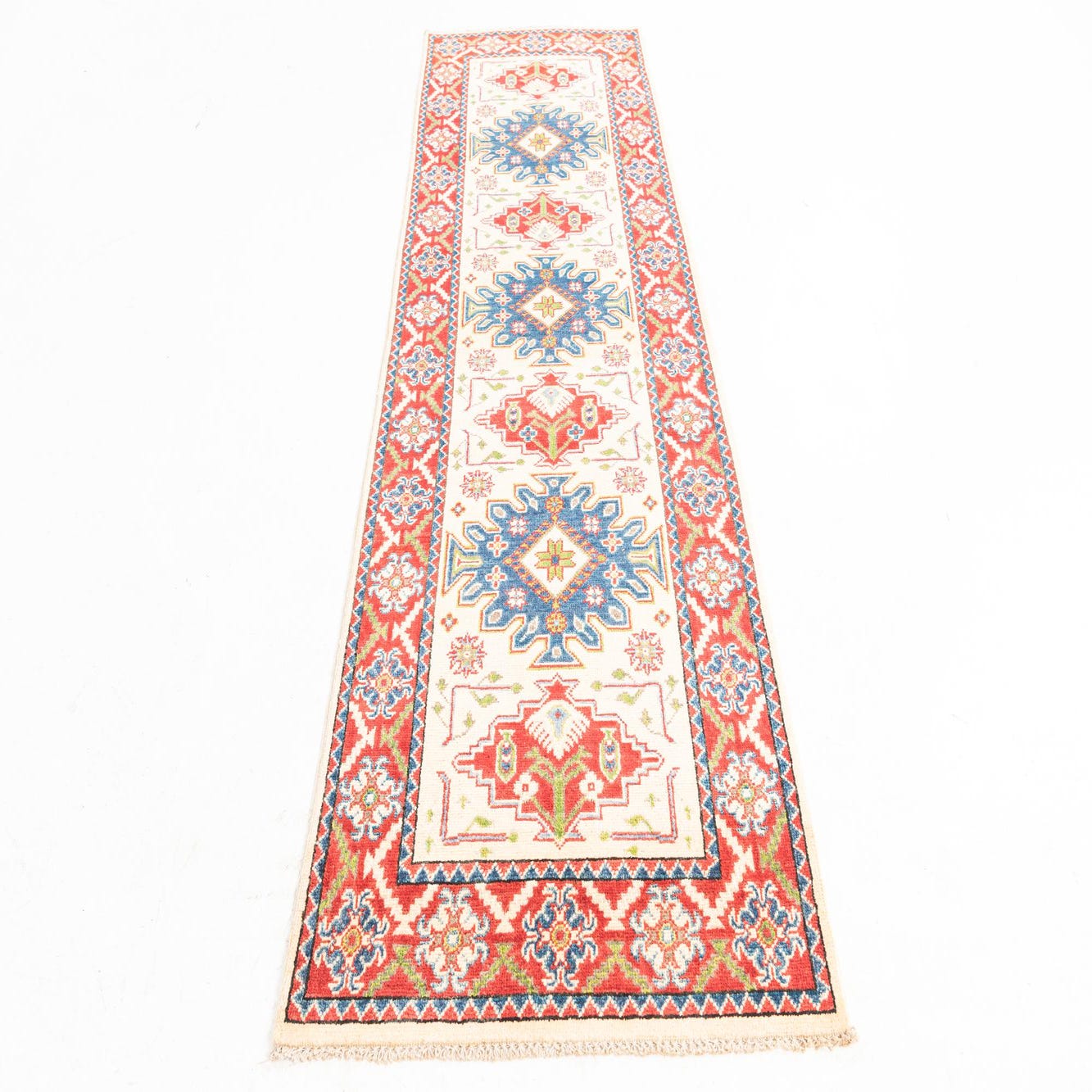 This Kazak collection rug is a 9 Ft Runner hand-knotted from 100% hand-spun wool, showcasing a robust handcrafted quality with a dense and comfortable texture. The pattern is a dynamic interplay of traditional geometric and stylized floral motifs that create a compelling visual narrative across its length. Dominant colors include cream, forming the inviting backdrop, along with an intricate combination of blue, brown, red, and green that complements and defines the ornate design. Each end of the runner is completed with fringe detailing, adding to its traditional charm.