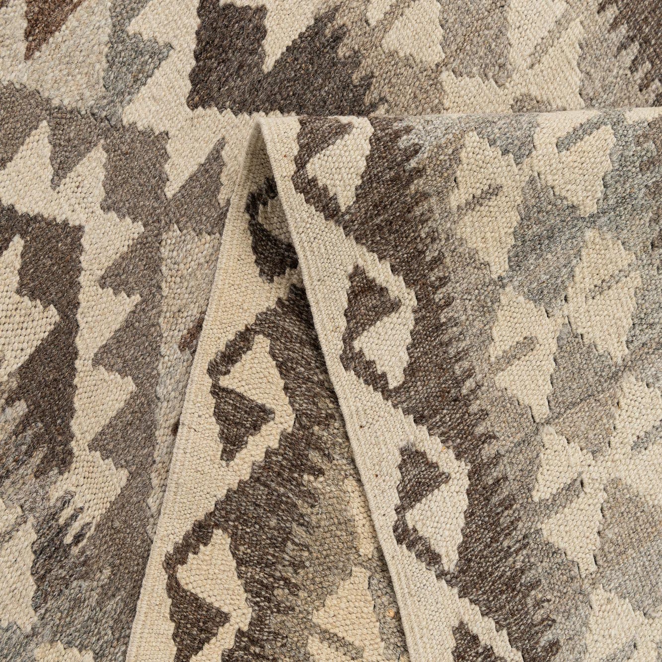 A 9 ft runner rug from the Kilim Maymana collection, featuring a flatweave tribal pattern in ivories, creams, and various shades of brown, perfect for a hallway.