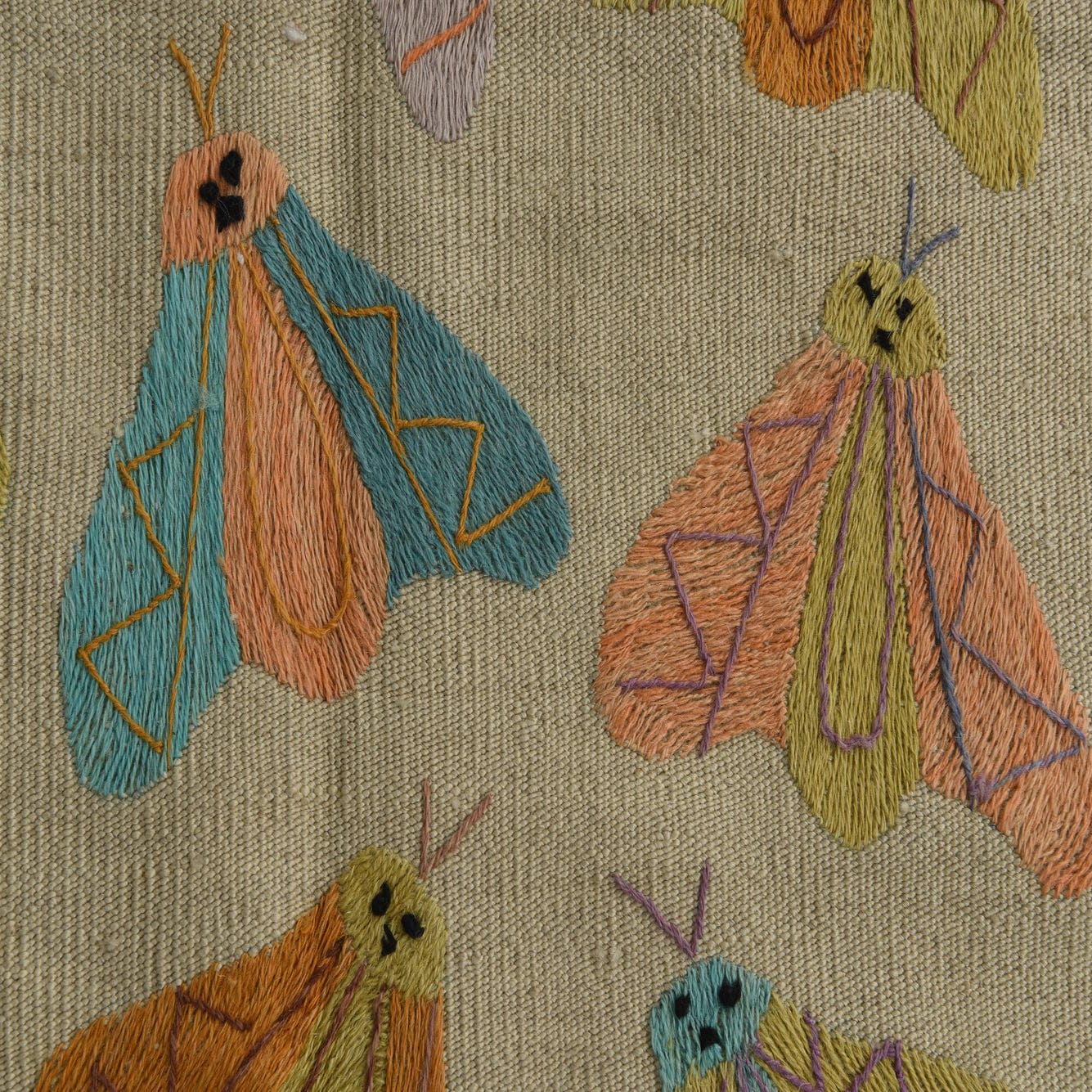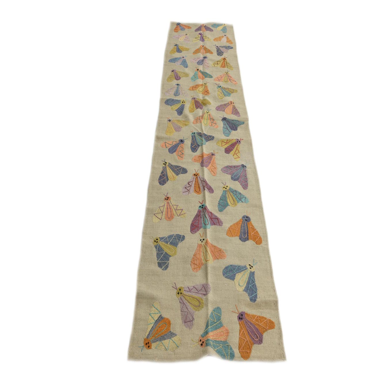 A hand-woven, 100% wool runner with a soft cream field punctuated by a scattered pattern of stylized butterfly and moth motifs. Each insect is rendered in lively color blocks and linear stitching, with accents of navy blue, olive, orange, yellow, green and small black details that define wing shapes and faces. The overall look balances folk-art charm and contemporary geometry—regular rows of playful motifs give visual rhythm while the neutral background keeps the design grounded.