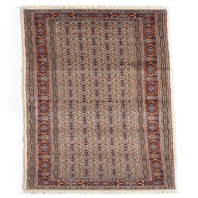 A 9 ft runner rug with a cream background and intricate Persian pattern in red, blue, green, and brown, featuring a decorative border and fringe.