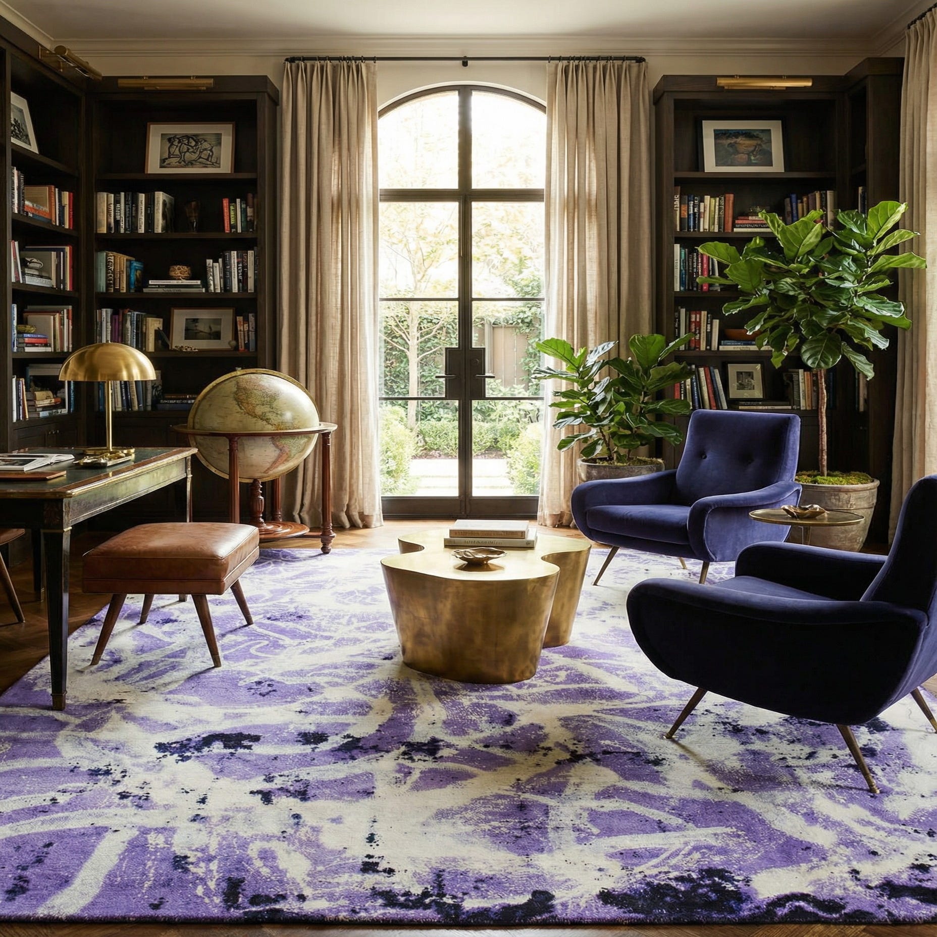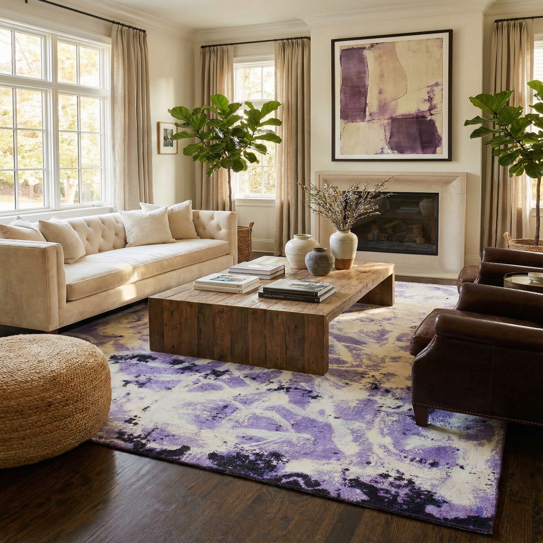 This rug works well in a contemporary living room where cool-toned upholstery and metallic accents are used, or in a bedroom to bring a calm, artistic layer beneath the bed. It also pairs nicely with mid-century modern furniture or an eclectic space that mixes pattern and texture—use the cream and lavender palette to brighten neutral walls and draw out black hardware or picture frames for contrast.