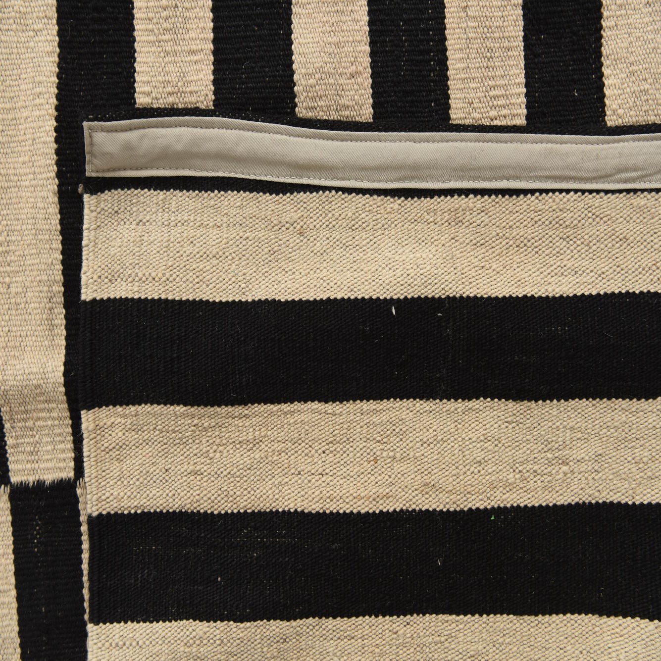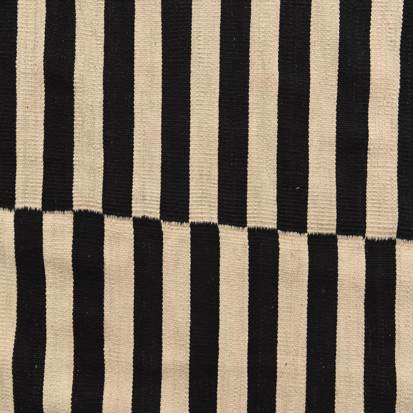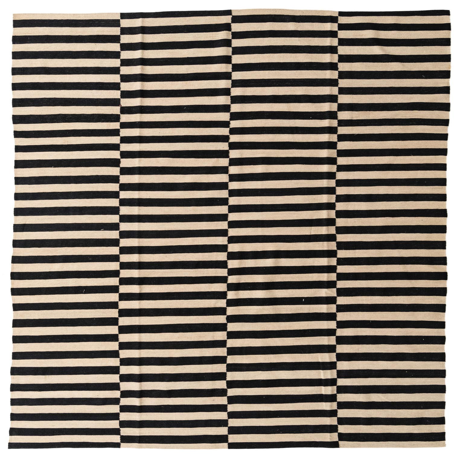 A 9x11 rectangular Kilim Modern rug with a bold black and ivory striped pattern, handmade from wool.