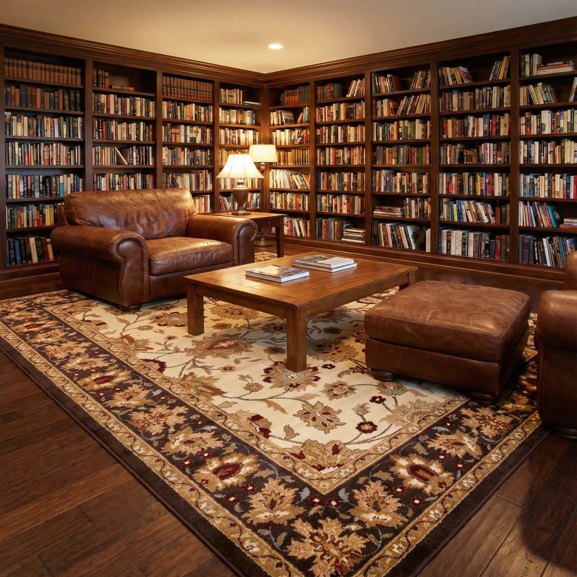 A traditional floral pattern unfolds across a cream field, with symmetrical medallions and scrolling vines that create a balanced, classic layout. A deep brown border frames the design, punctuated by tan and red blossoms and small light-blue and light-green accents that add subtle color contrast. The overall look is refined without being ornate, offering a familiar Persian-inspired aesthetic that works with a range of furnishings.