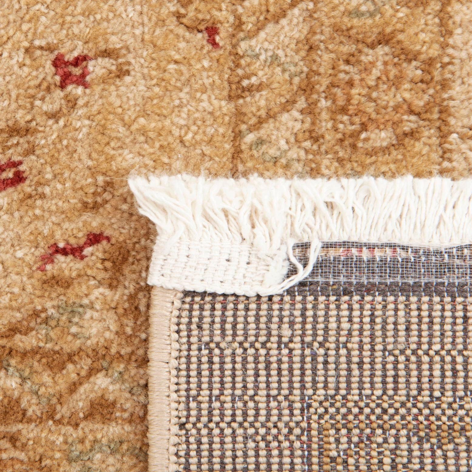 Primary color is Cream. Colors in this rug include: Cream, Beige, Light Brown, Light Green, Red.