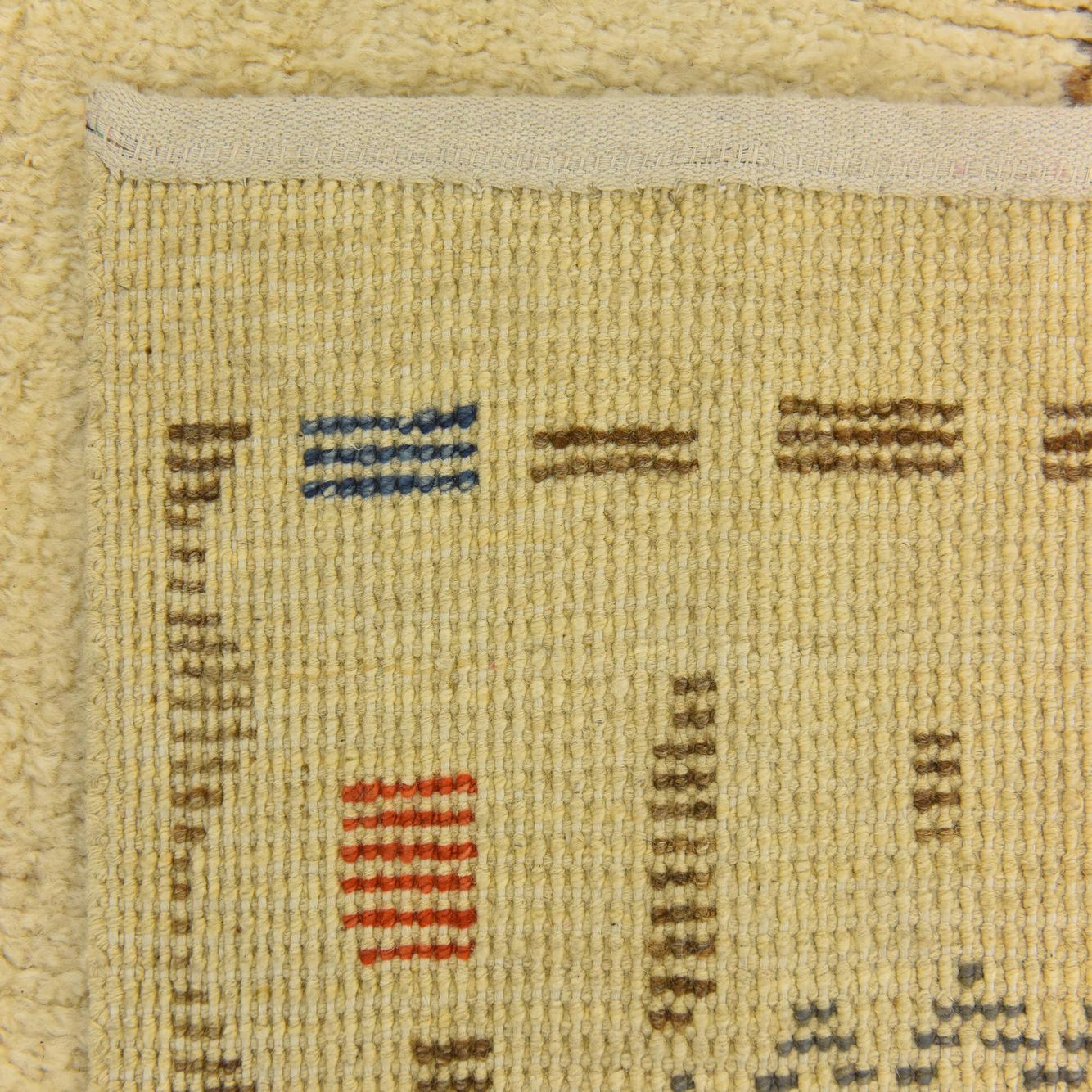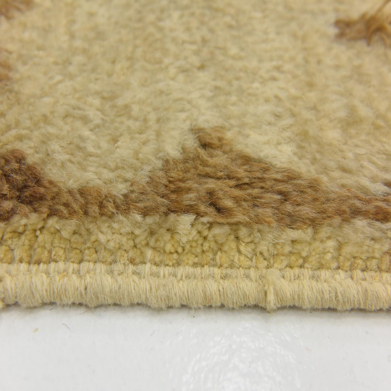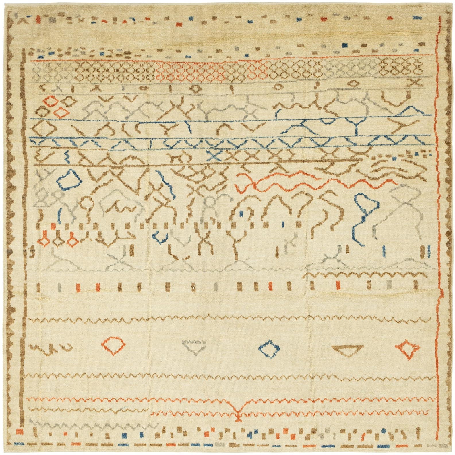 Hand-knotted of 100% wool, this rug has a soft, tactile pile that invites bare feet and adds a warm, natural texture to a room. A cream field provides a calm backdrop for an array of hand-drawn, linear motifs arranged in horizontal registers—tiny geometric blocks, wavy lines, and irregular diamond and hook shapes appear like a contemporary sampler. The palette pairs warm brown and terracotta accents with cool gray and navy blue details, creating a balanced, lived-in look while a narrow brown outline gives the piece subtle definition.