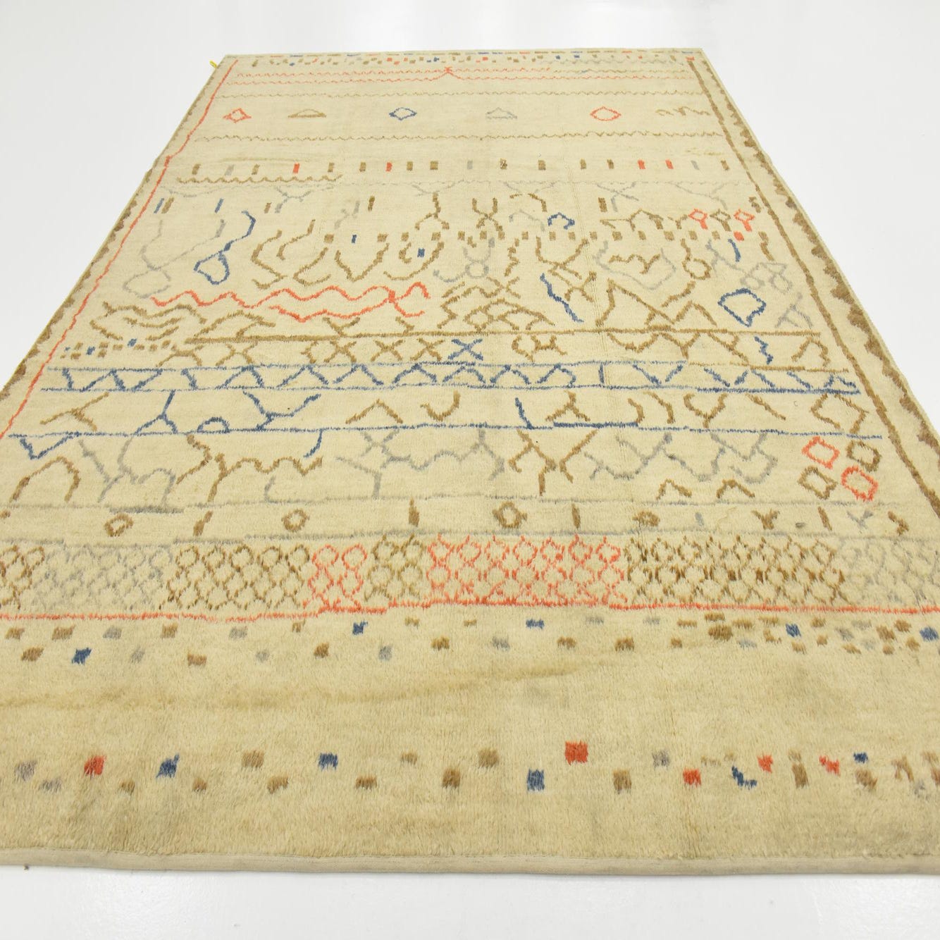 A 9x12 rectangular ivory wool rug with a Southwestern tribal pattern featuring abstract shapes in blue, brown, and orange.