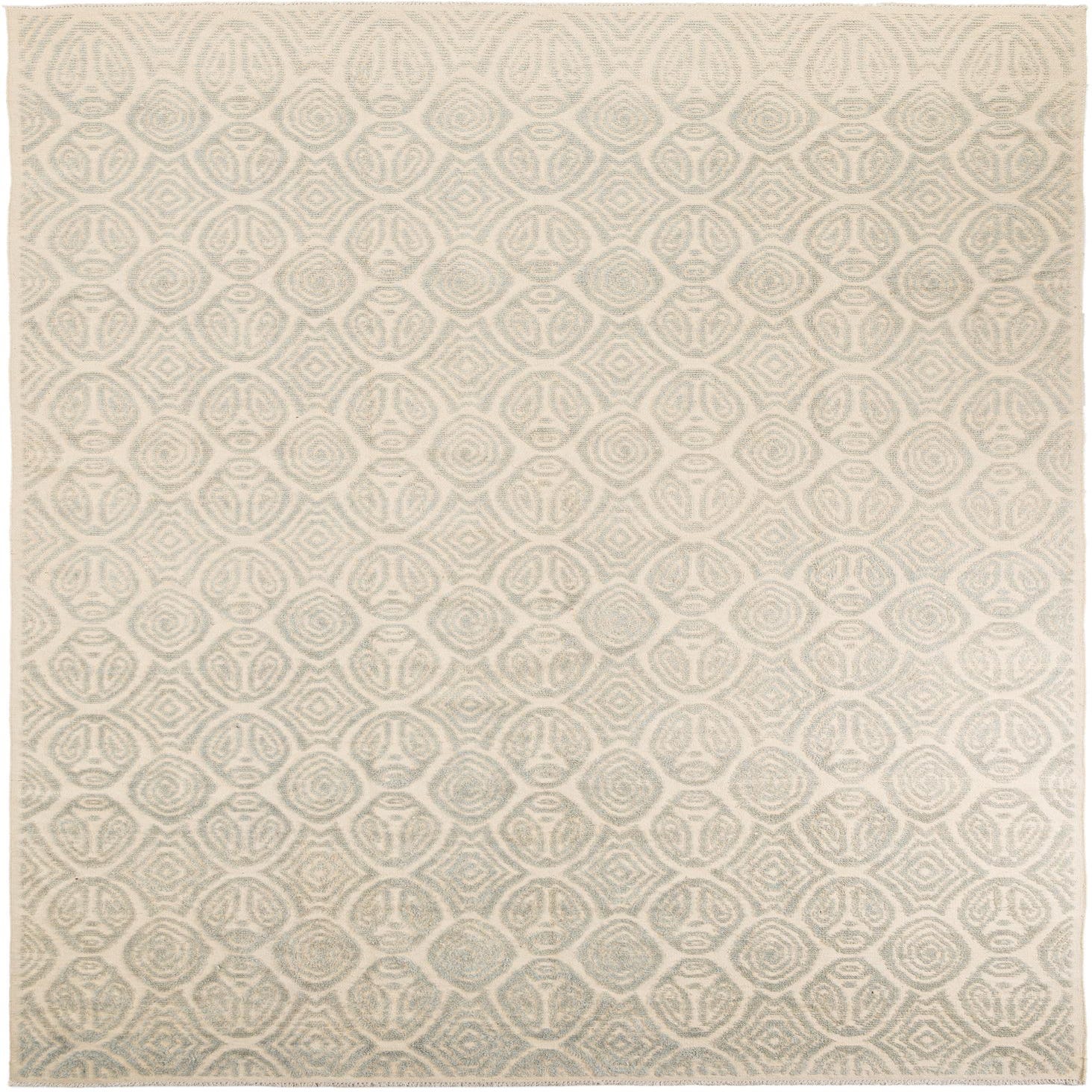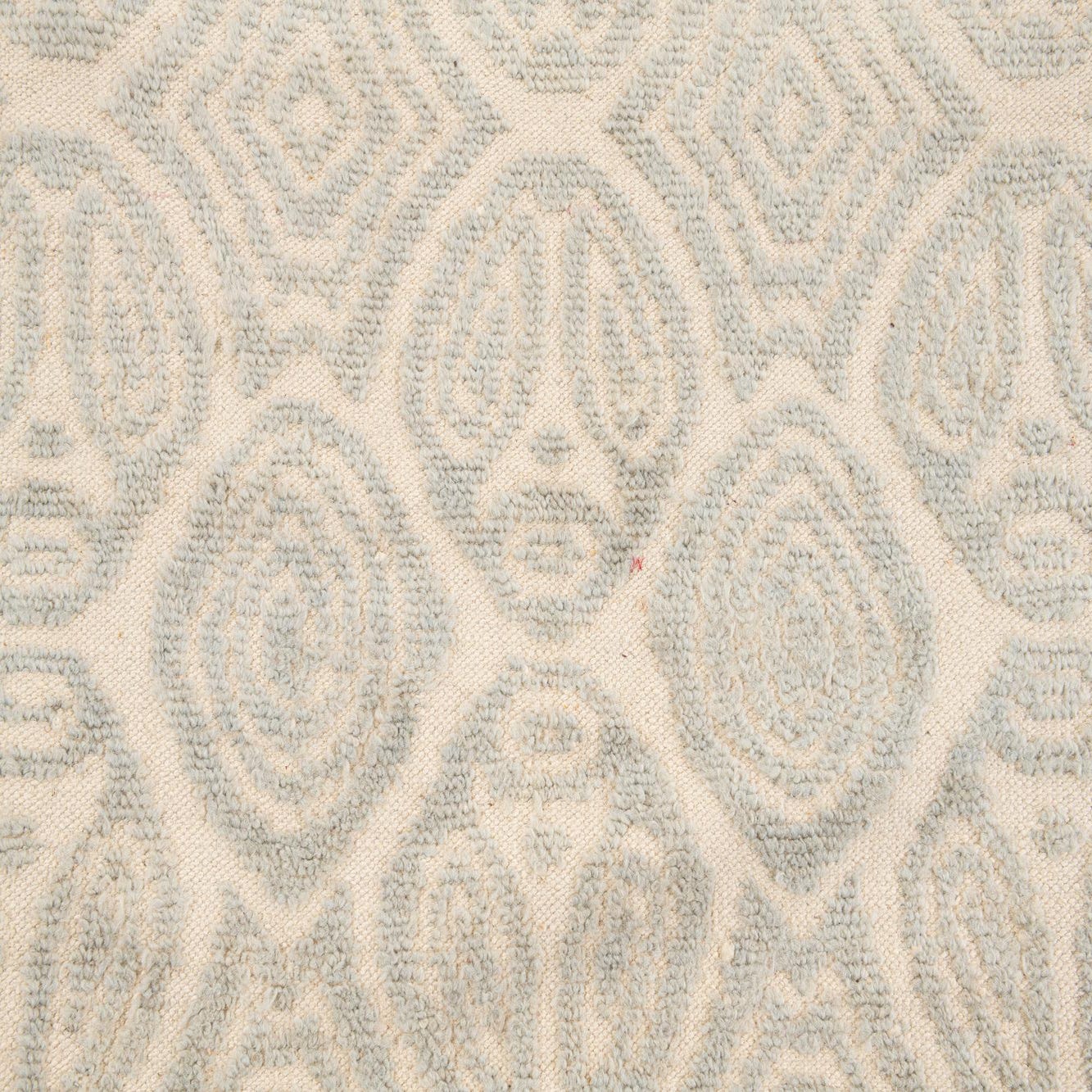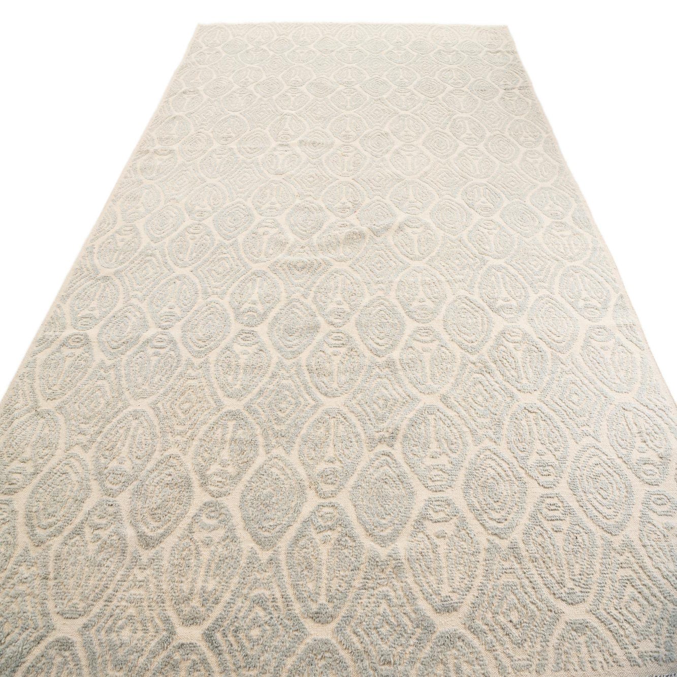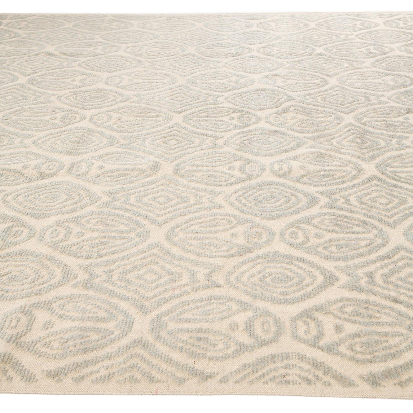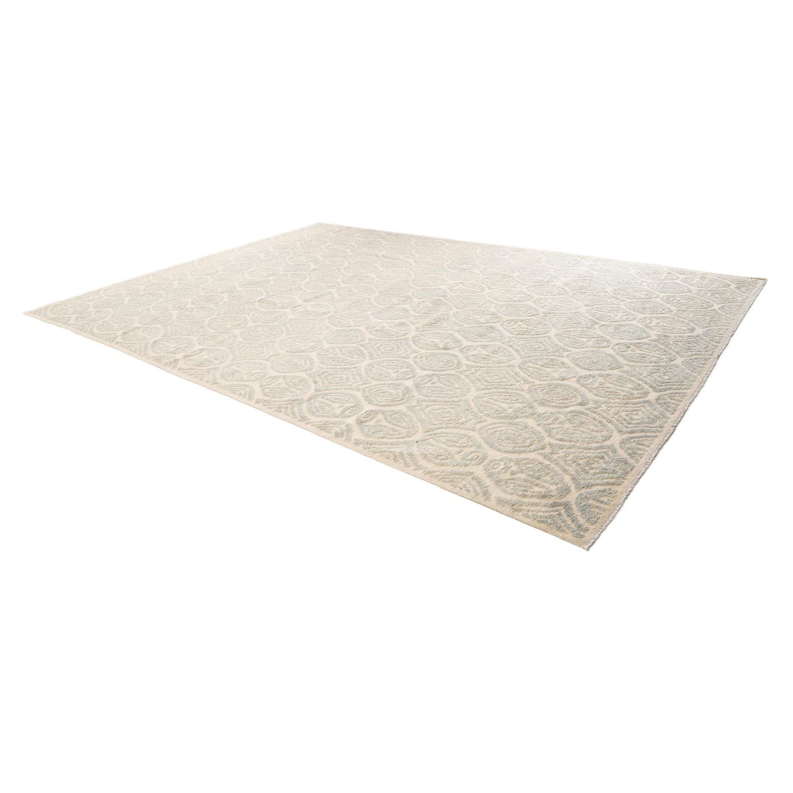 A 9x12 rectangular ivory wool rug with a subtle modern geometric pattern in cream and light grey, suitable for a living room.
