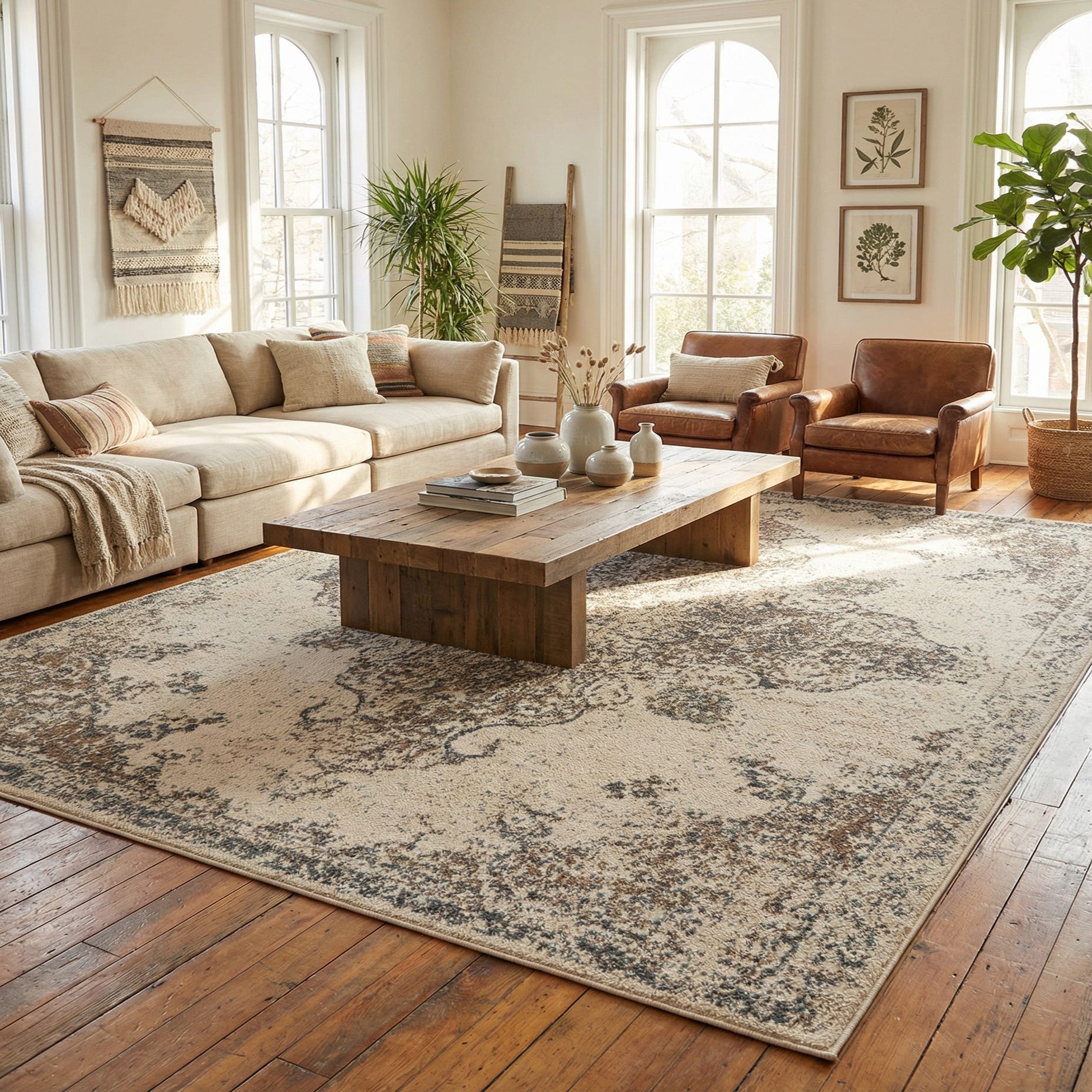 This neutral palette and vintage character suit a range of interiors—pair it with warm wood furniture for a cozy living room, set it beneath a dining table to soften a casual dining area, or use it to anchor a bedroom seating arrangement with linen textiles. It complements transitional, modern farmhouse, and coastal-inspired schemes, and works well with both warm metals and matte black finishes for contrast.