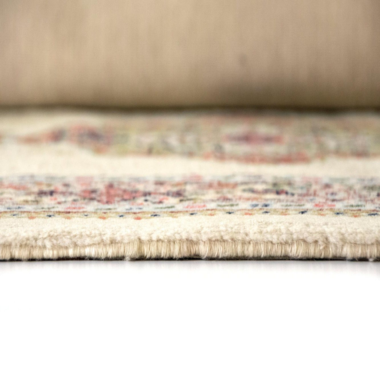 Primary color is Cream. Colors in this rug include: Cream, Light Green, Pink, Dark Blue.