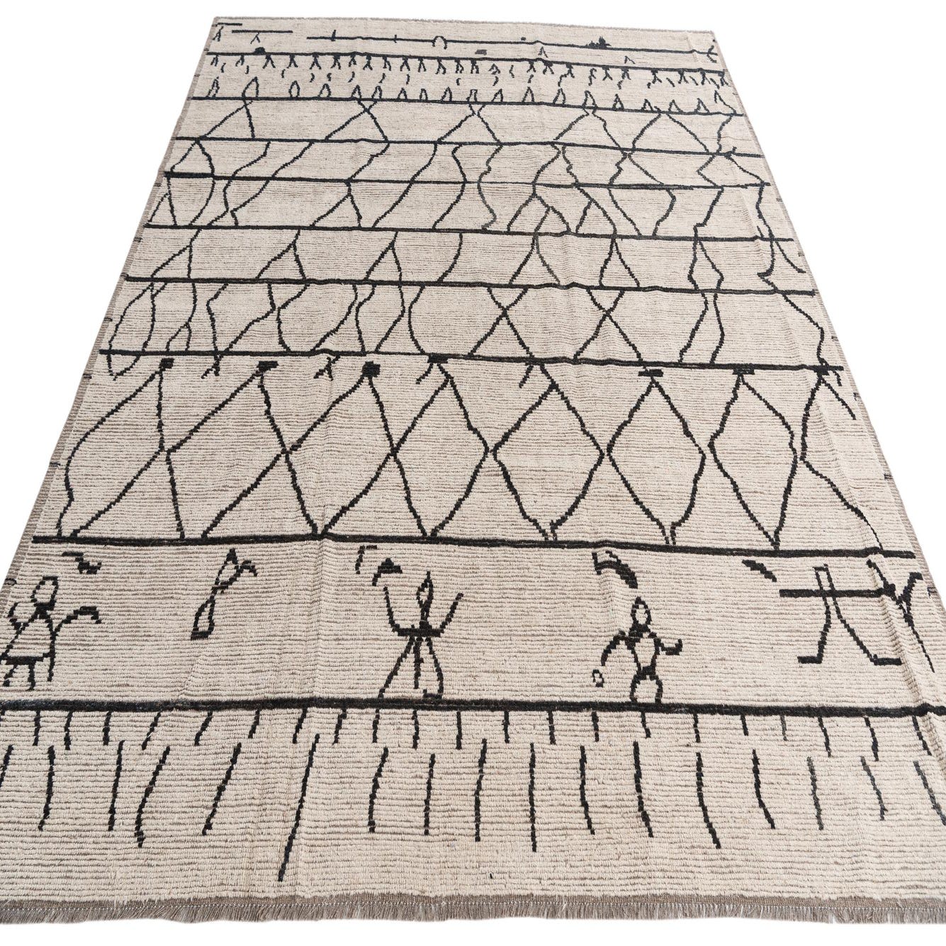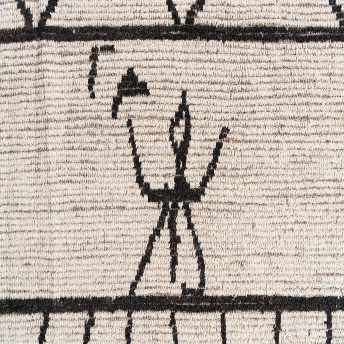 A 9x12 rectangular ivory shag rug with a bold black tribal and abstract pattern, featuring geometric lines and stick figures.
