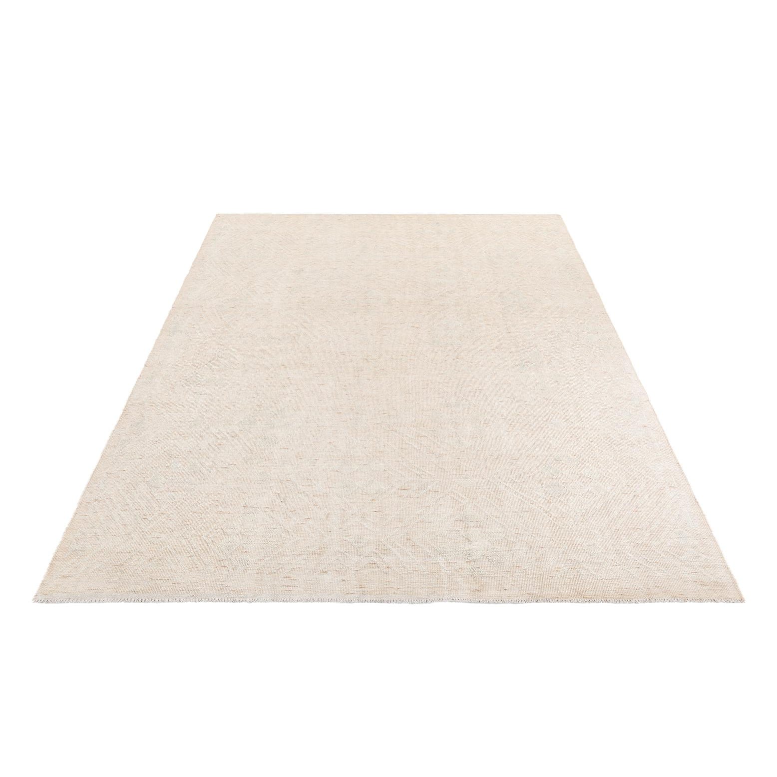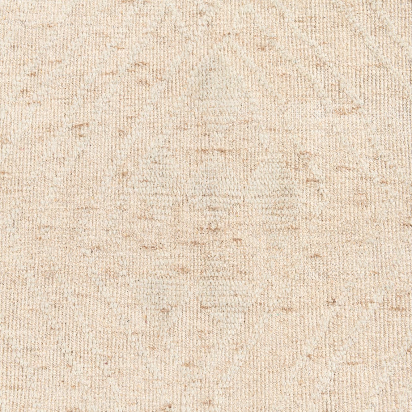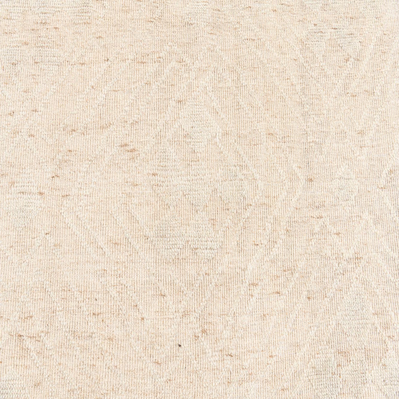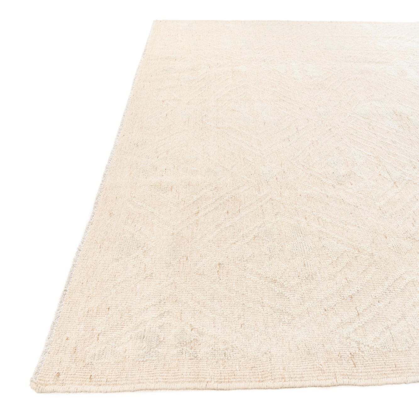 Hand-knotted from 100% wool, this rug pairs a cream ground with subtle ivory geometric motifs for a quietly patterned look. The design uses linear diamond and trellis shapes worked into the pile, creating gentle movement across the surface without heavy contrast. The low-profile wool pile has a soft, tactile feel underfoot and shows natural tonal variation and hand-knotted texture that add depth to the neutral palette.
