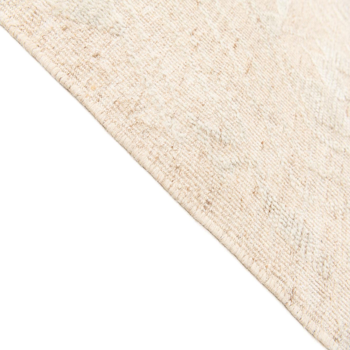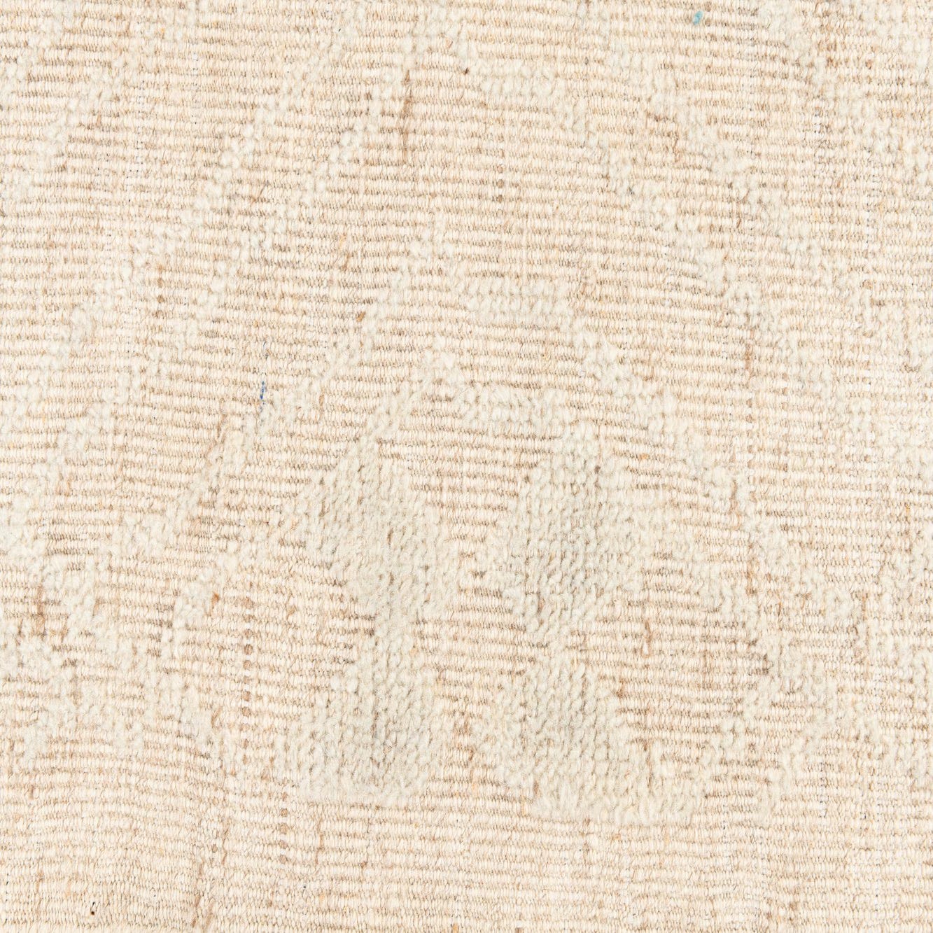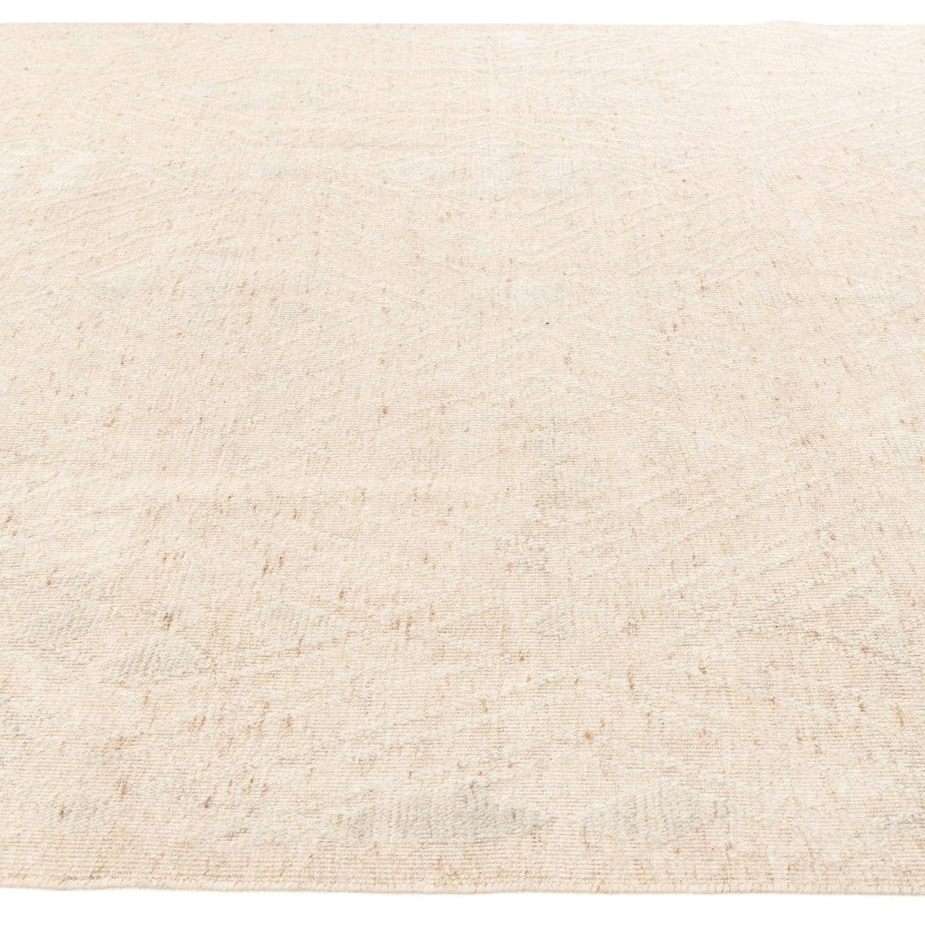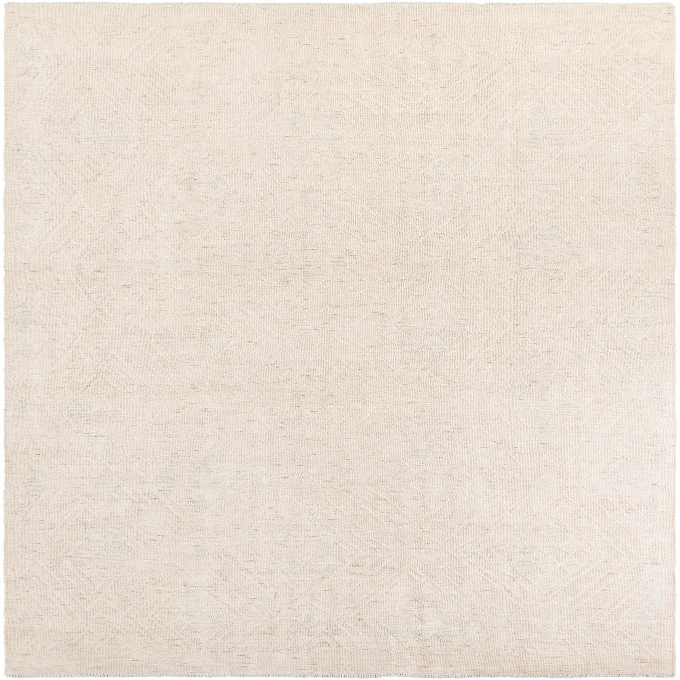 Hand-knotted from 100% wool, this rug pairs a cream ground with subtle ivory geometric motifs for a quietly patterned look. The design uses linear diamond and trellis shapes worked into the pile, creating gentle movement across the surface without heavy contrast. The low-profile wool pile has a soft, tactile feel underfoot and shows natural tonal variation and hand-knotted texture that add depth to the neutral palette.