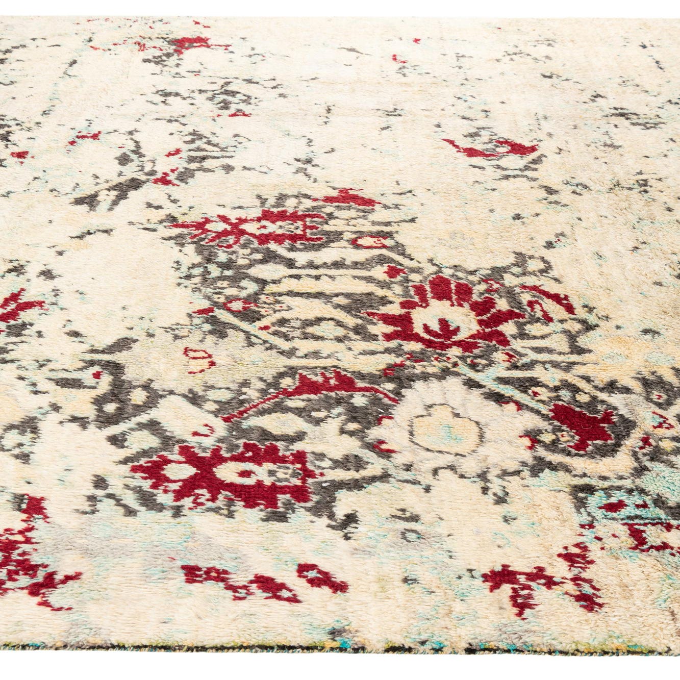 A 9x12 rectangular ivory shag rug with a modern tribal pattern in deep red, charcoal, and light blue accents, suitable for a living room.