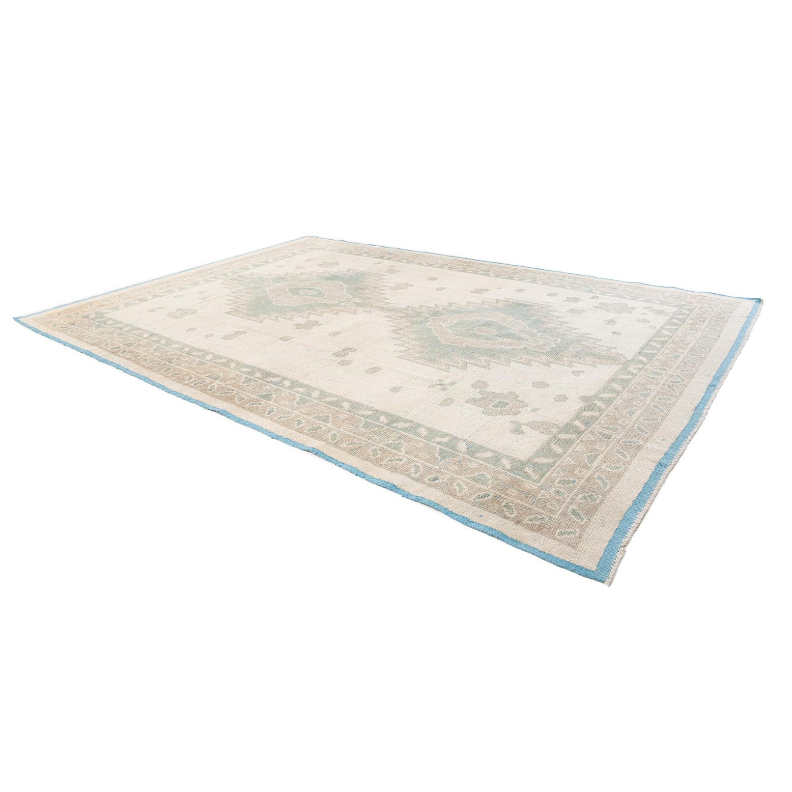 A 9x12 rectangular ivory wool rug with a modern medallion pattern in muted teal and beige, featuring a light blue border.