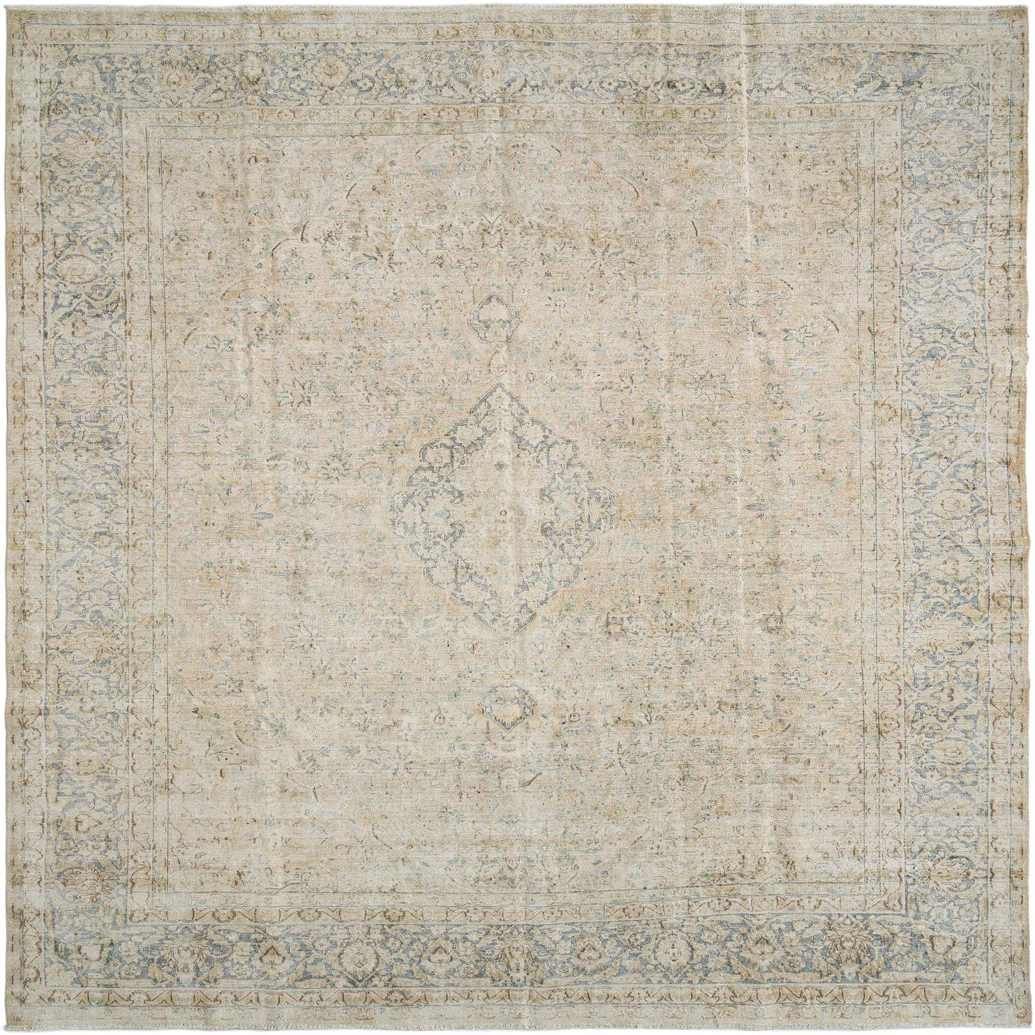 A 9x12 rectangular ivory Persian wool rug with a faded blue medallion and border pattern, suitable for a living room.