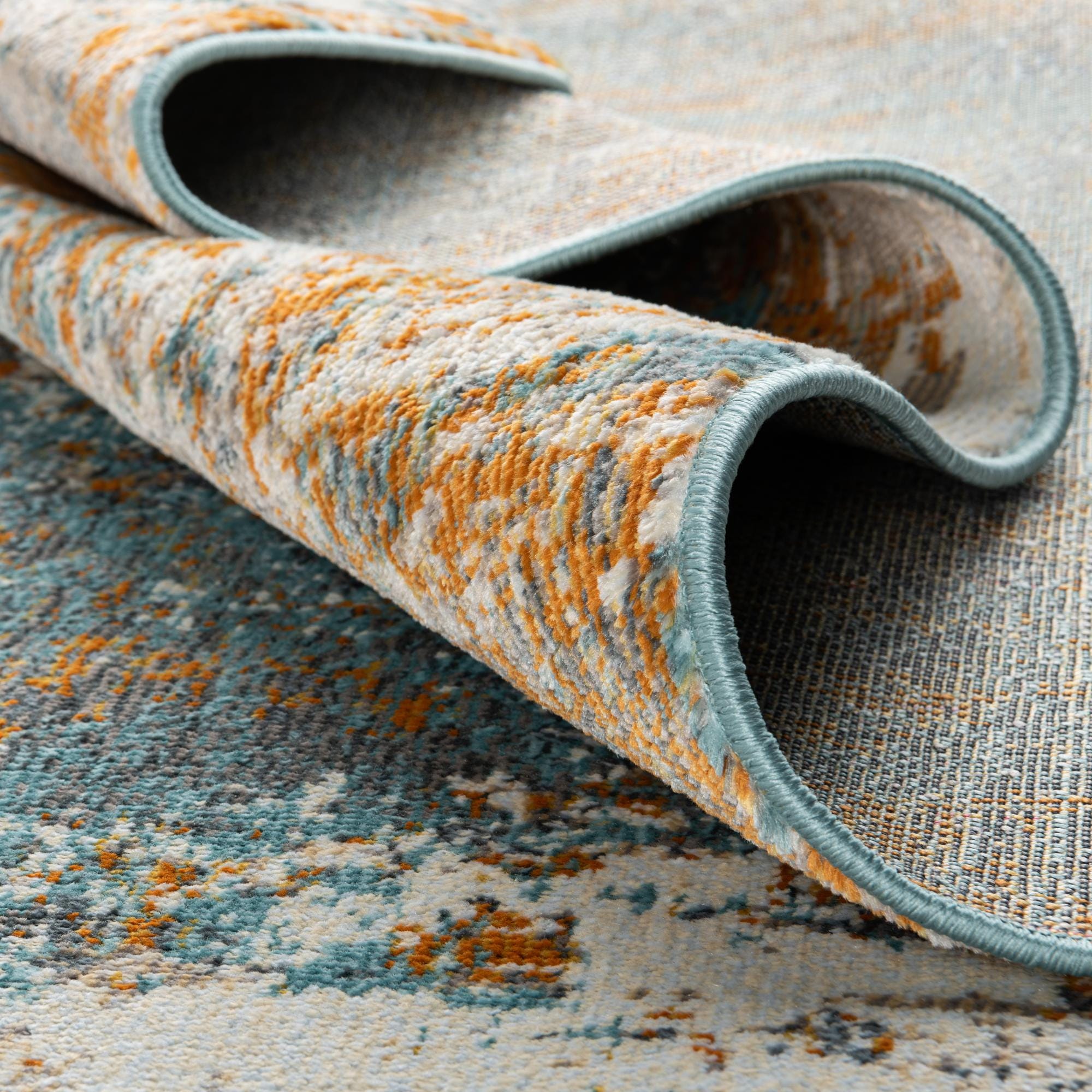 An abstract, painterly design spreads across a cream blue background, where layered washes of light blue, gray and beige blend with lively orange accents. The pattern has a distressed, mottled effect that creates visual depth without heavy texture. Machine-made of 100% polypropylene, the rug has a low pile with a smooth, slightly dense hand and a subtle sheen from the multi-tone yarns, so the surface feels soft underfoot while maintaining a neat, tailored look. The octagonal shape introduces a geometric edge that complements the rug’s organic pattern.