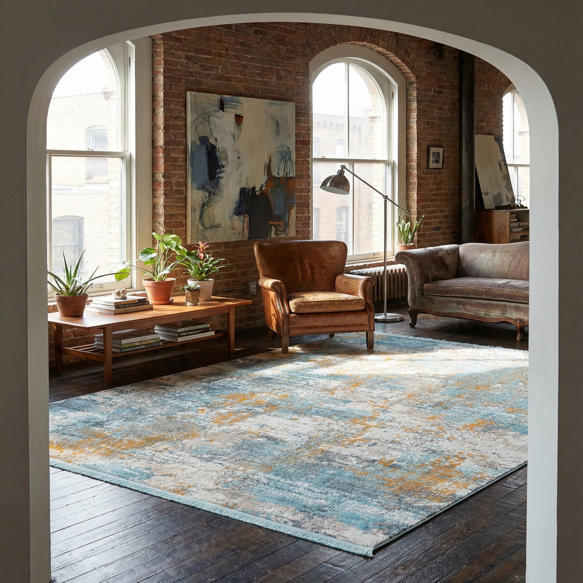 This palette pairs nicely with warm wood tones, light linen upholstery, or crisp white slipcovers—use it to anchor a living room seating area, add color under a bed, or bring visual interest to a home office. The combination of cool blues and warm orange accents complements coastal, contemporary, and eclectic interiors; introduce brass or matte-black hardware and natural-fiber accessories to complete the scheme.