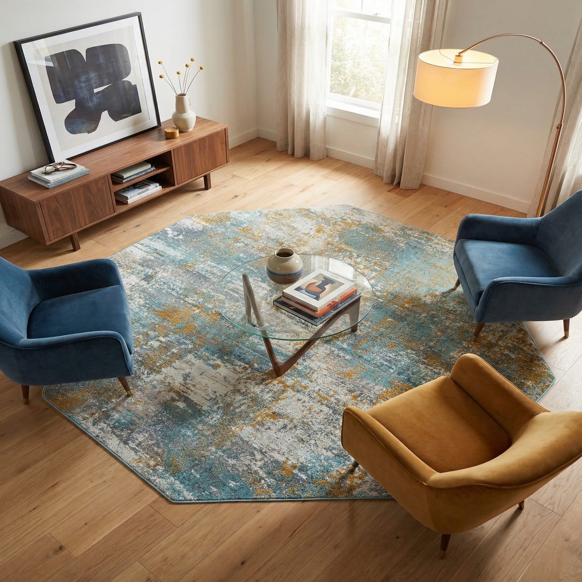 Machine made from 100% polypropylene, the construction produces a consistent, smooth surface that feels pleasant underfoot and lies flat in the room. Its contemporary look pairs nicely with mid-century modern furnishings and warm wood tones, coastal or transitional interiors that favor soft blues and neutrals, and casual living spaces or entryways where an on-trend, lived-in aesthetic is desired. The octagon shape also works well beneath a round dining table or as a focal layer in a seating nook.