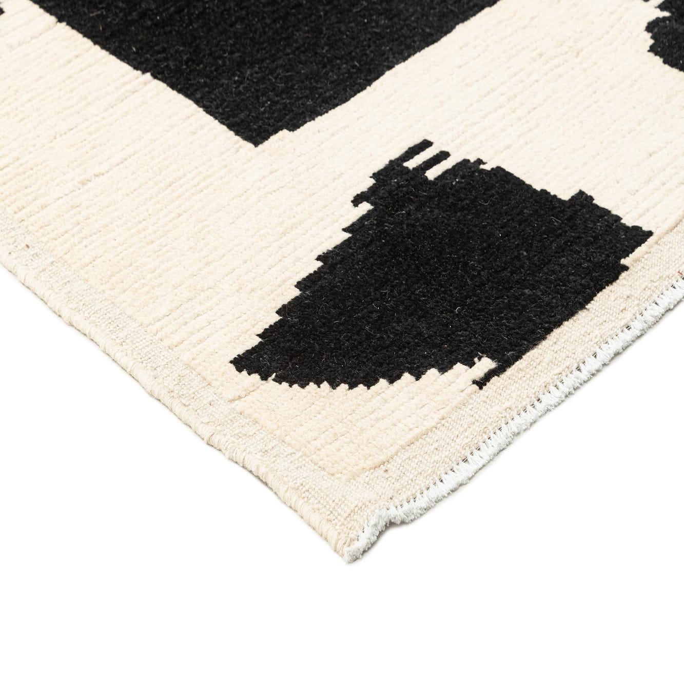 A rectangular Beni Marok rug with a cream background and abstract black shapes, showcasing its handmade wool texture.