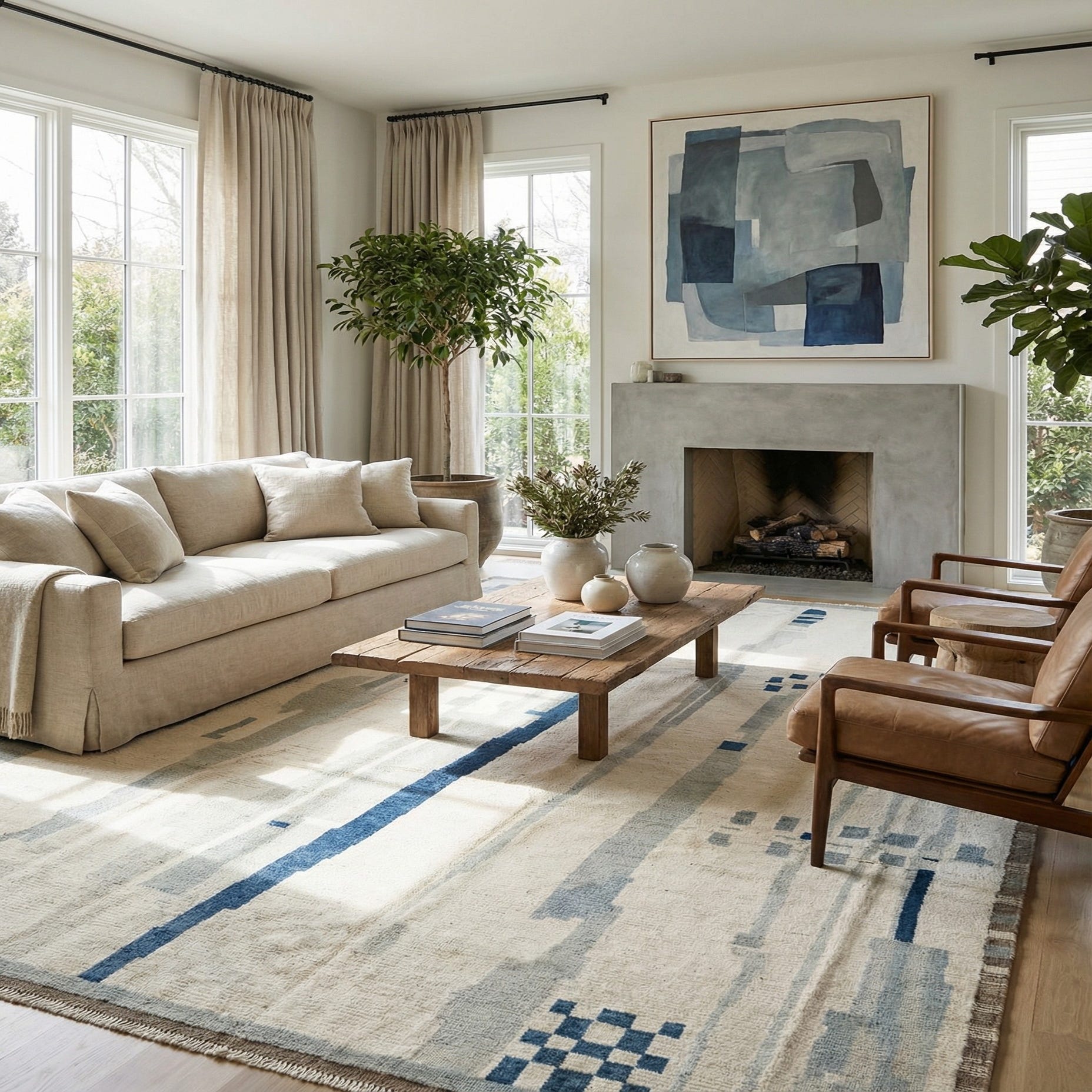 A handmade rectangular Beni Marok rug featuring an ivory background with abstract blue and gray geometric patterns.