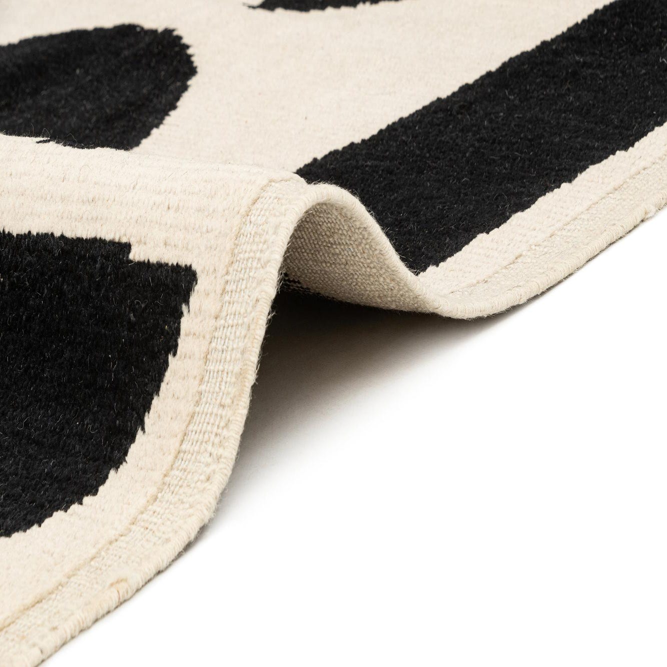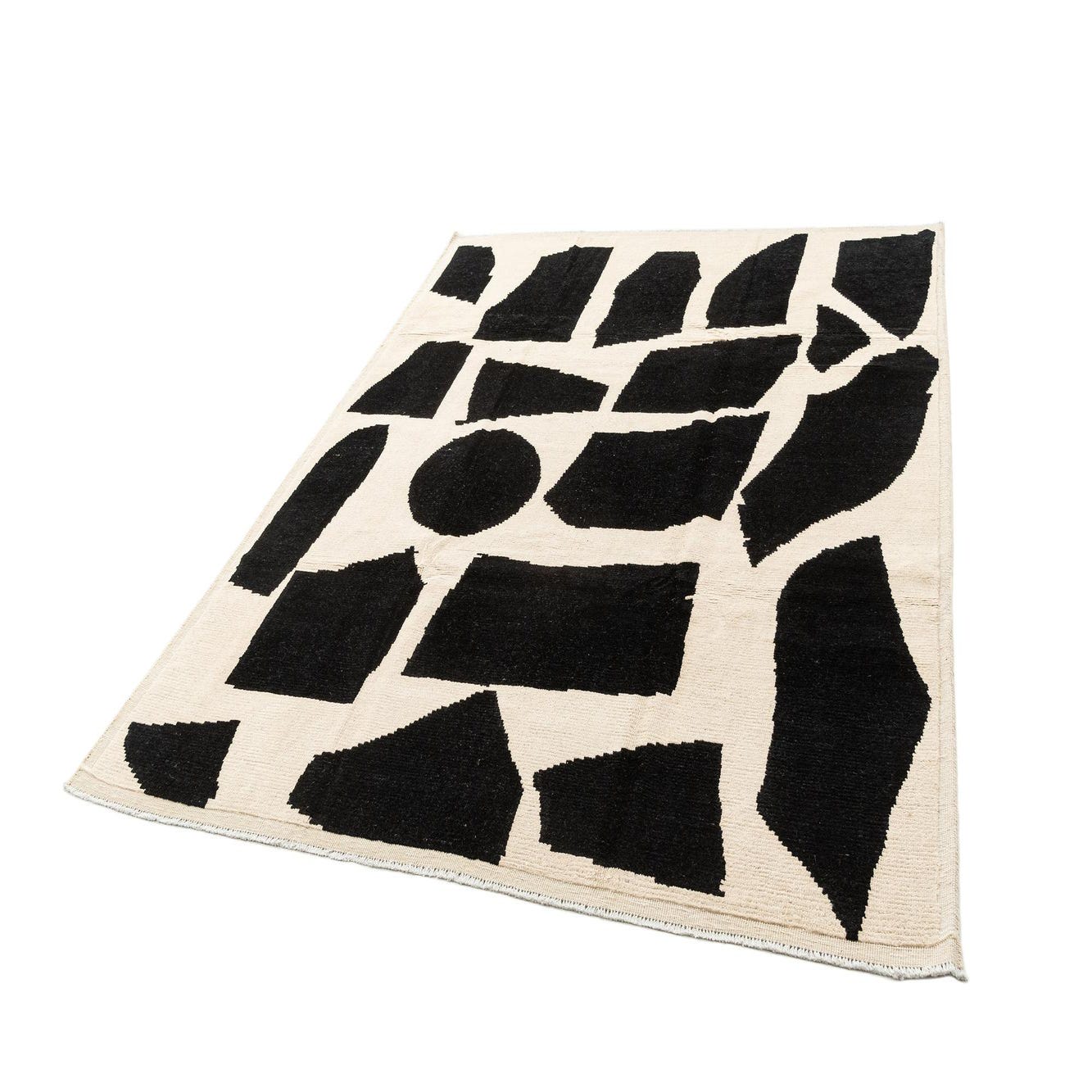 A rectangular Beni Marok rug with a black abstract geometric pattern on an ivory background, showcasing its handmade wool texture.