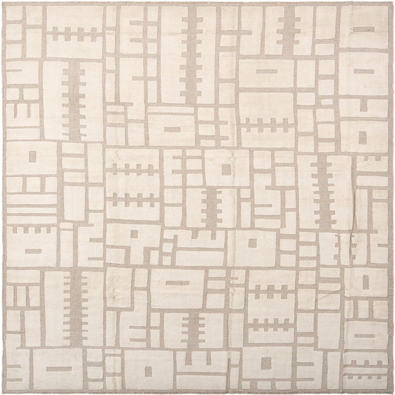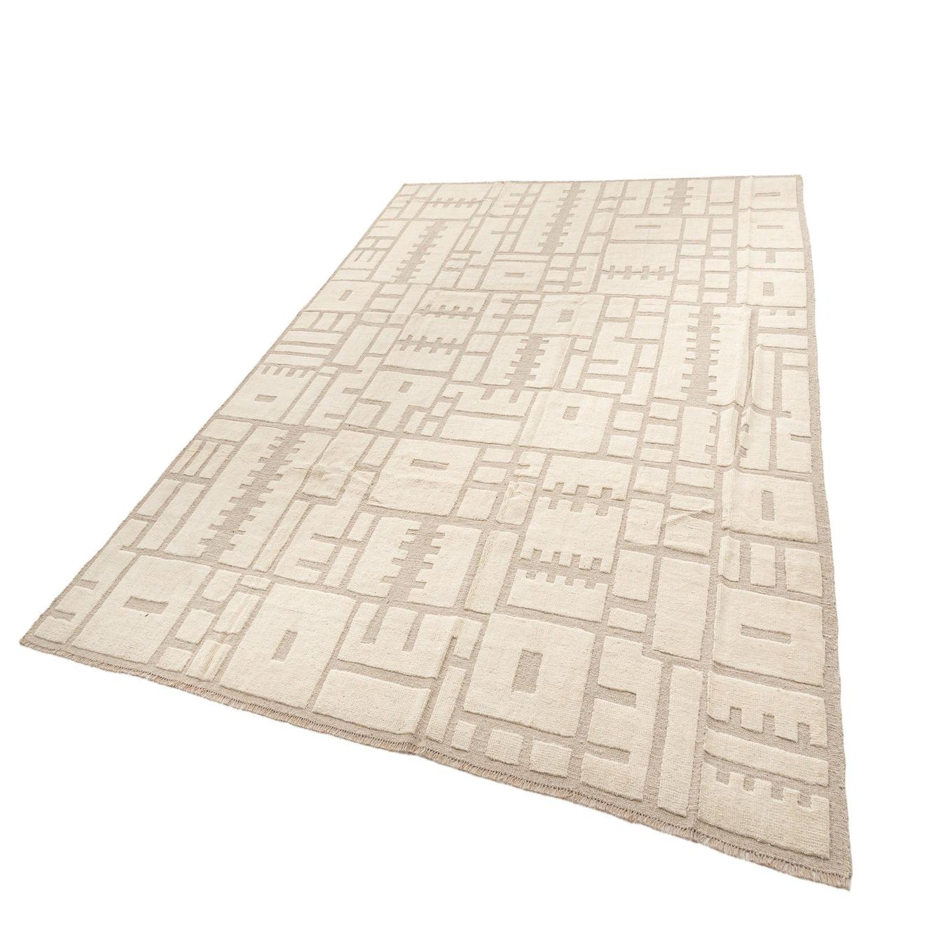 Handmade rectangular ivory wool rug with a geometric Persian pattern, featuring cream-colored shapes on a light beige background.