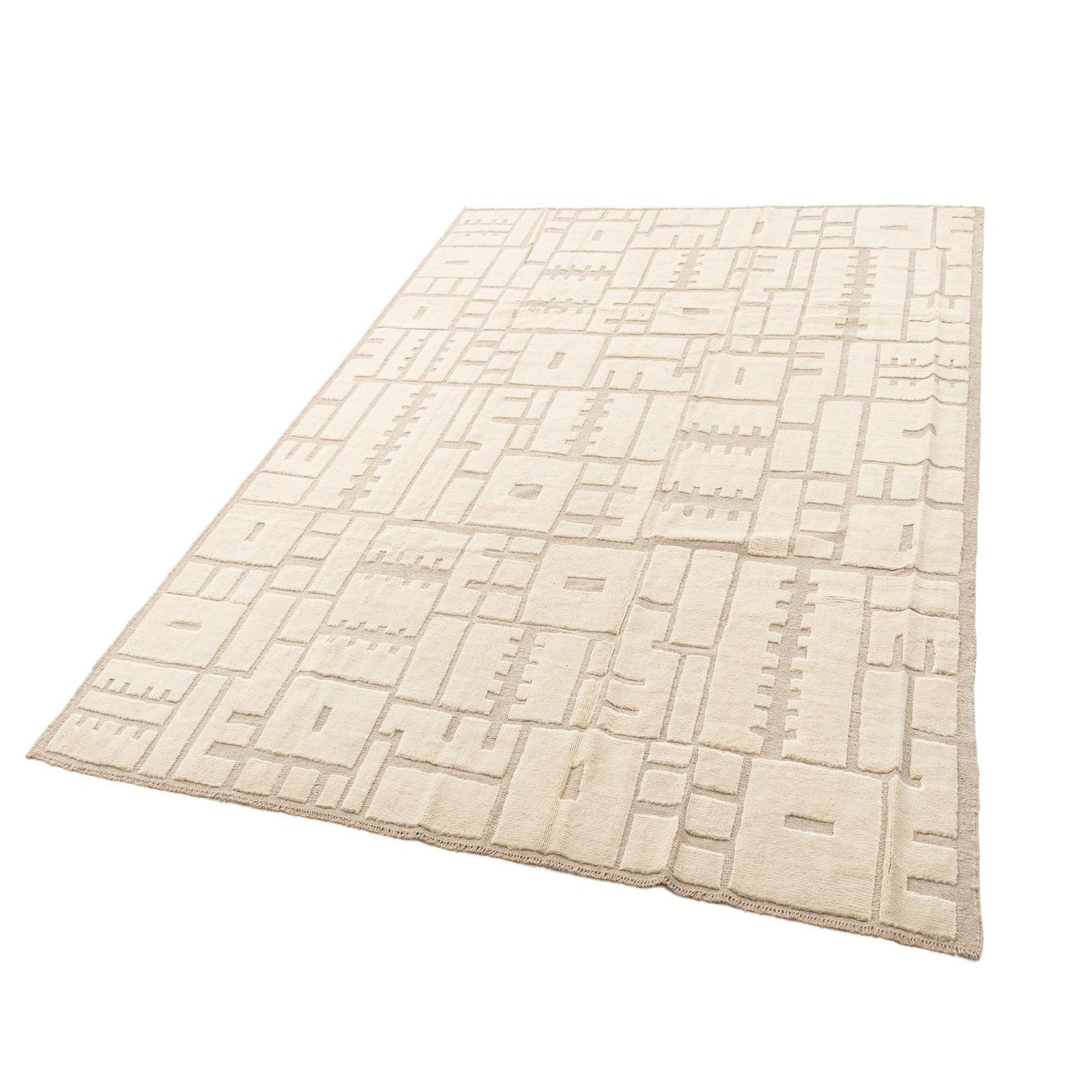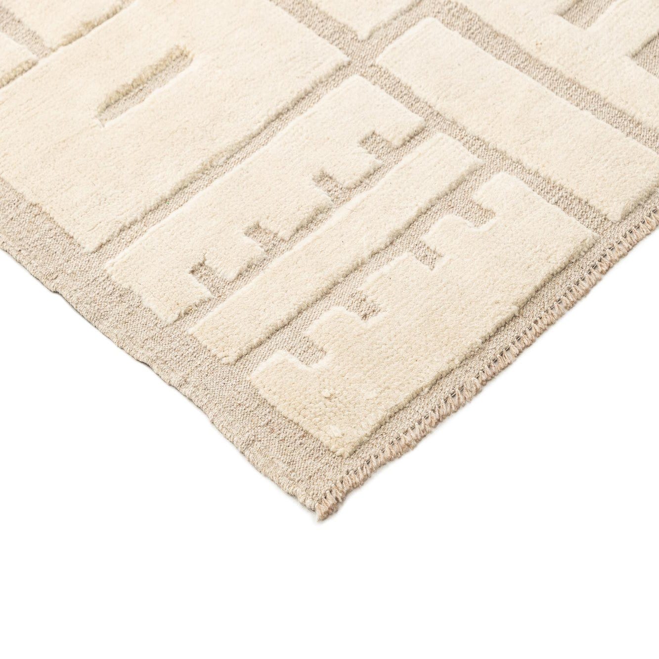 A rectangular ivory and cream wool rug featuring a geometric Persian pattern with a medium pile, suitable for indoor use.