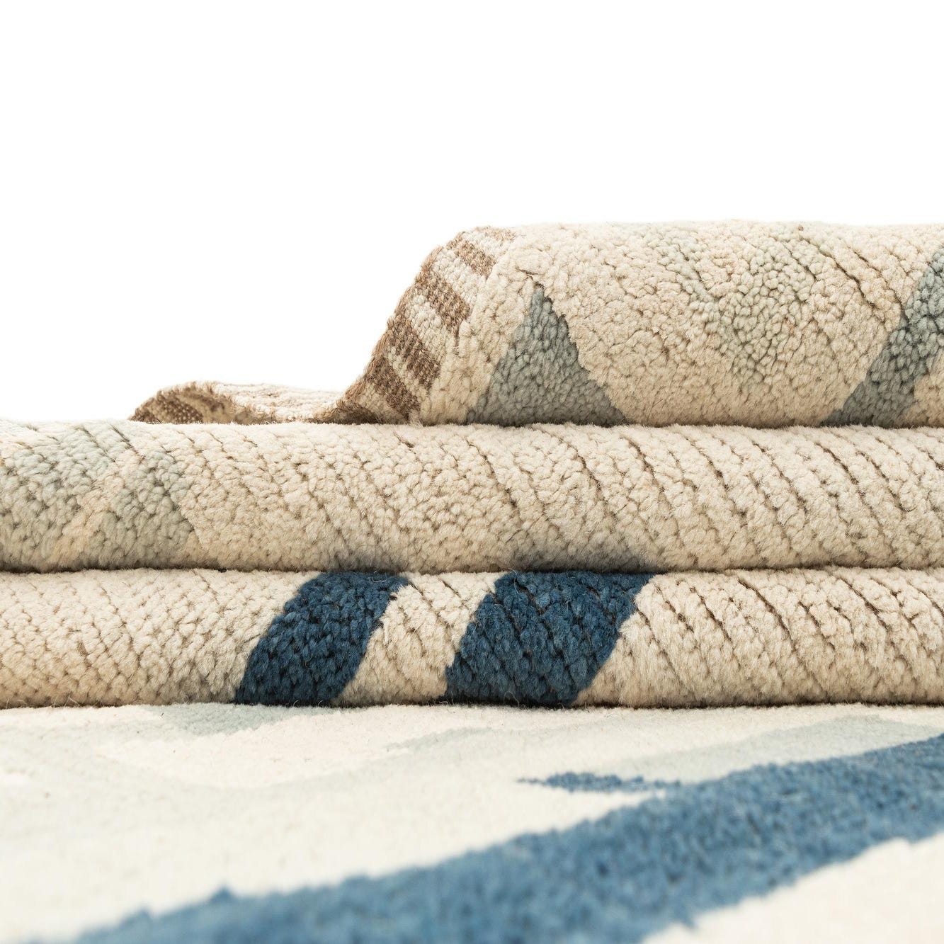 Handmade rectangular ivory wool rug with an abstract Persian pattern in shades of blue and gray.