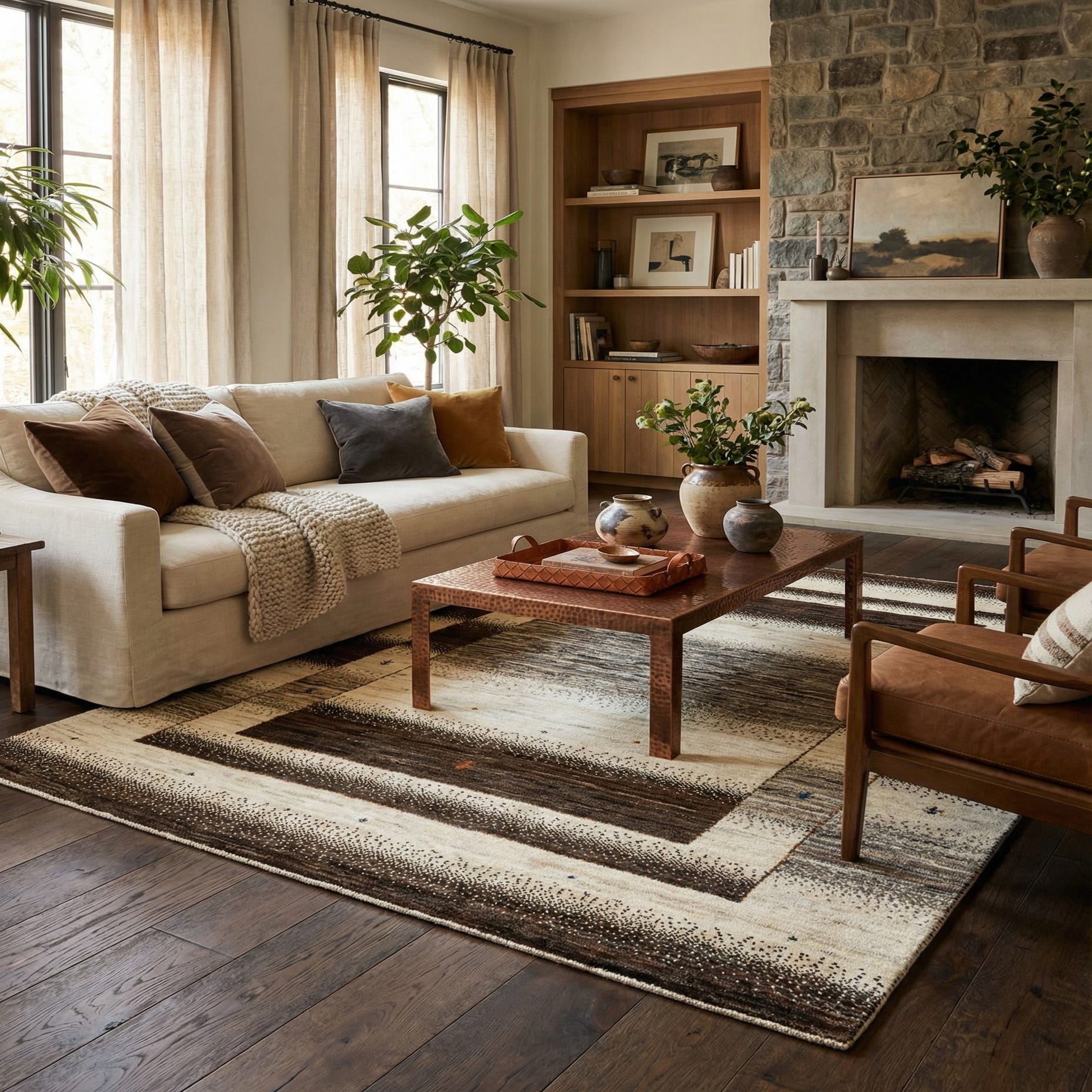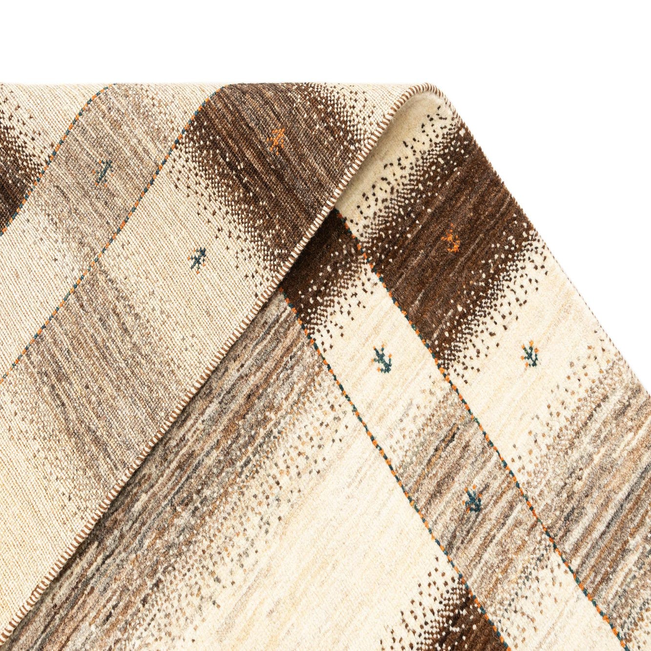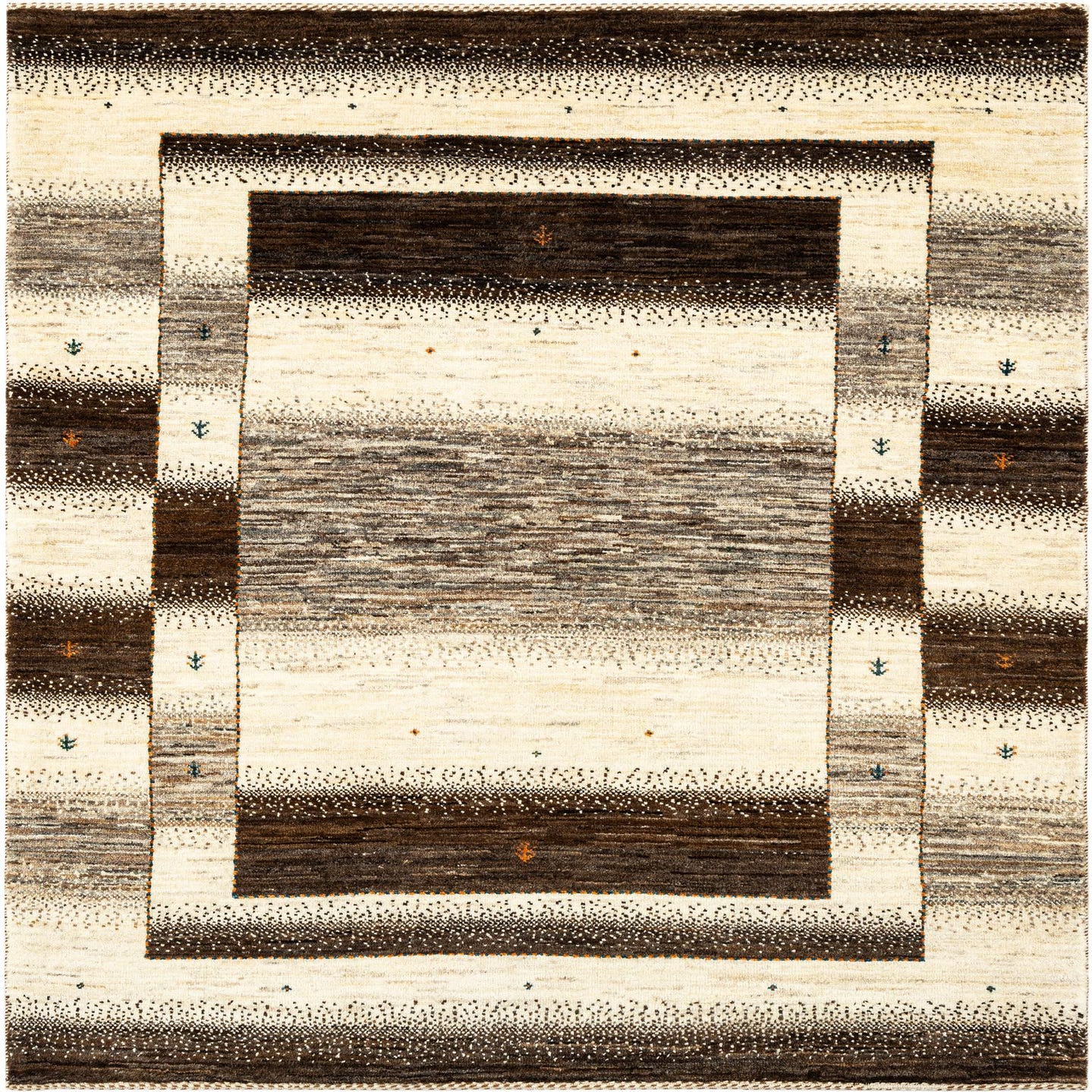 Handmade rectangular Persian rug in ivory and brown, featuring a striped border and a central rectangular pattern with subtle flecks.