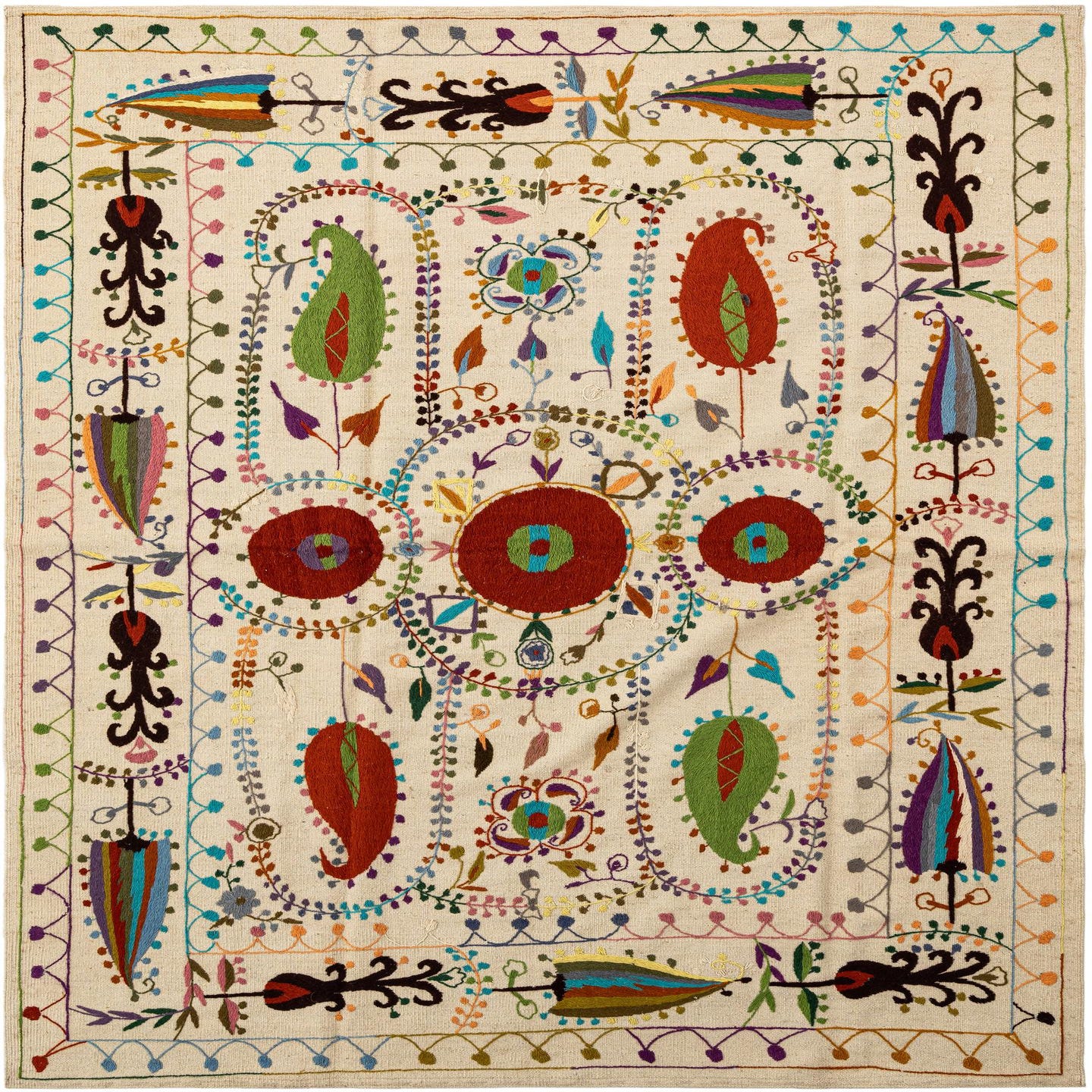 A rectangular ivory wool rug with a vibrant, intricate Persian tribal pattern featuring large red, green, and blue floral and paisley motifs.