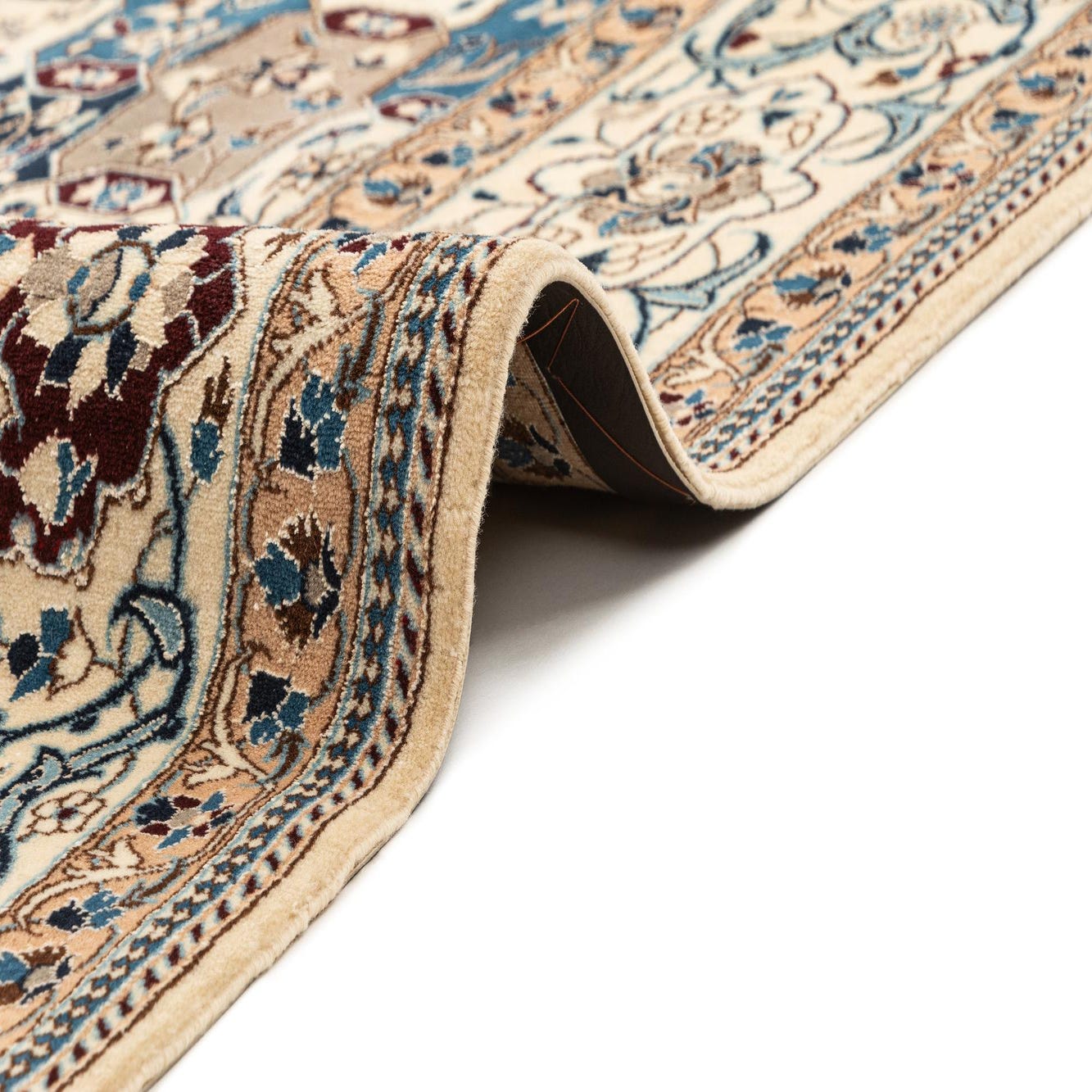 A handmade rectangular Persian rug featuring an intricate floral and geometric pattern in ivory, cream, blue, and brown tones.