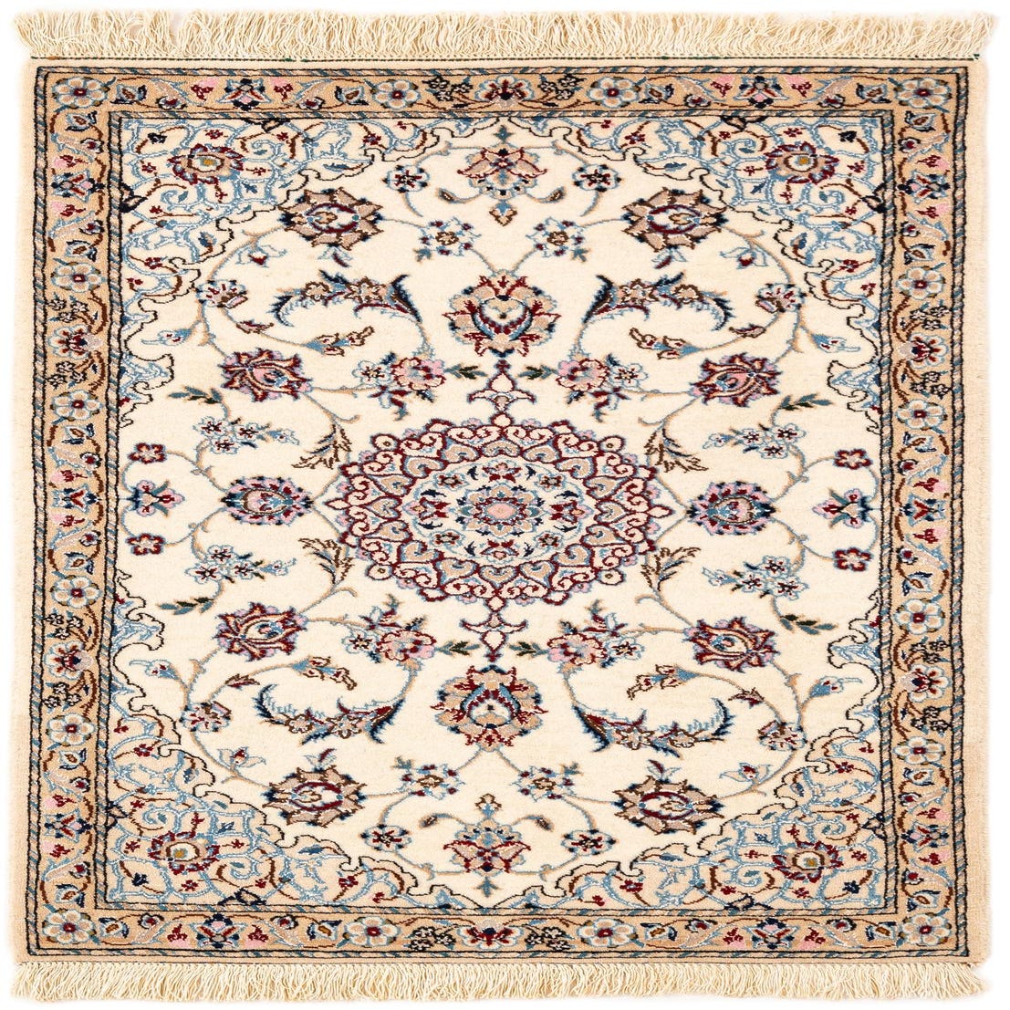 Handmade rectangular Persian rug in ivory with intricate floral medallions and a detailed border, featuring blue, red, and beige accents.