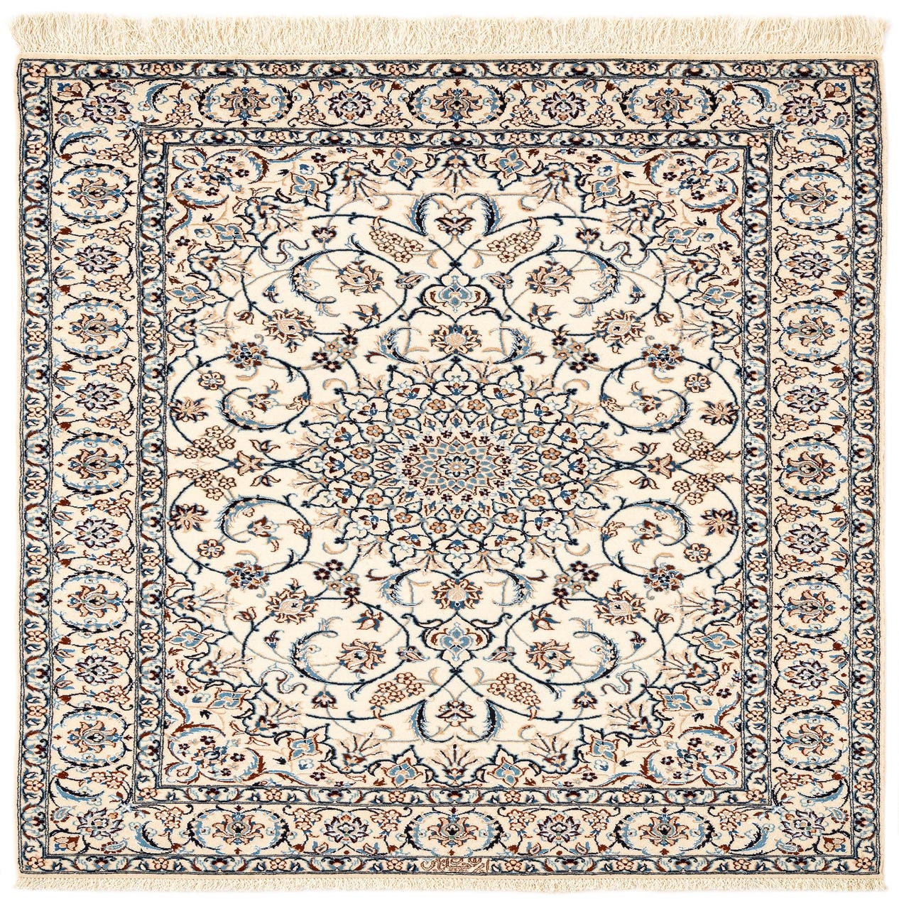 Handmade rectangular ivory Persian rug with intricate blue and brown floral medallion pattern and fringed edges.