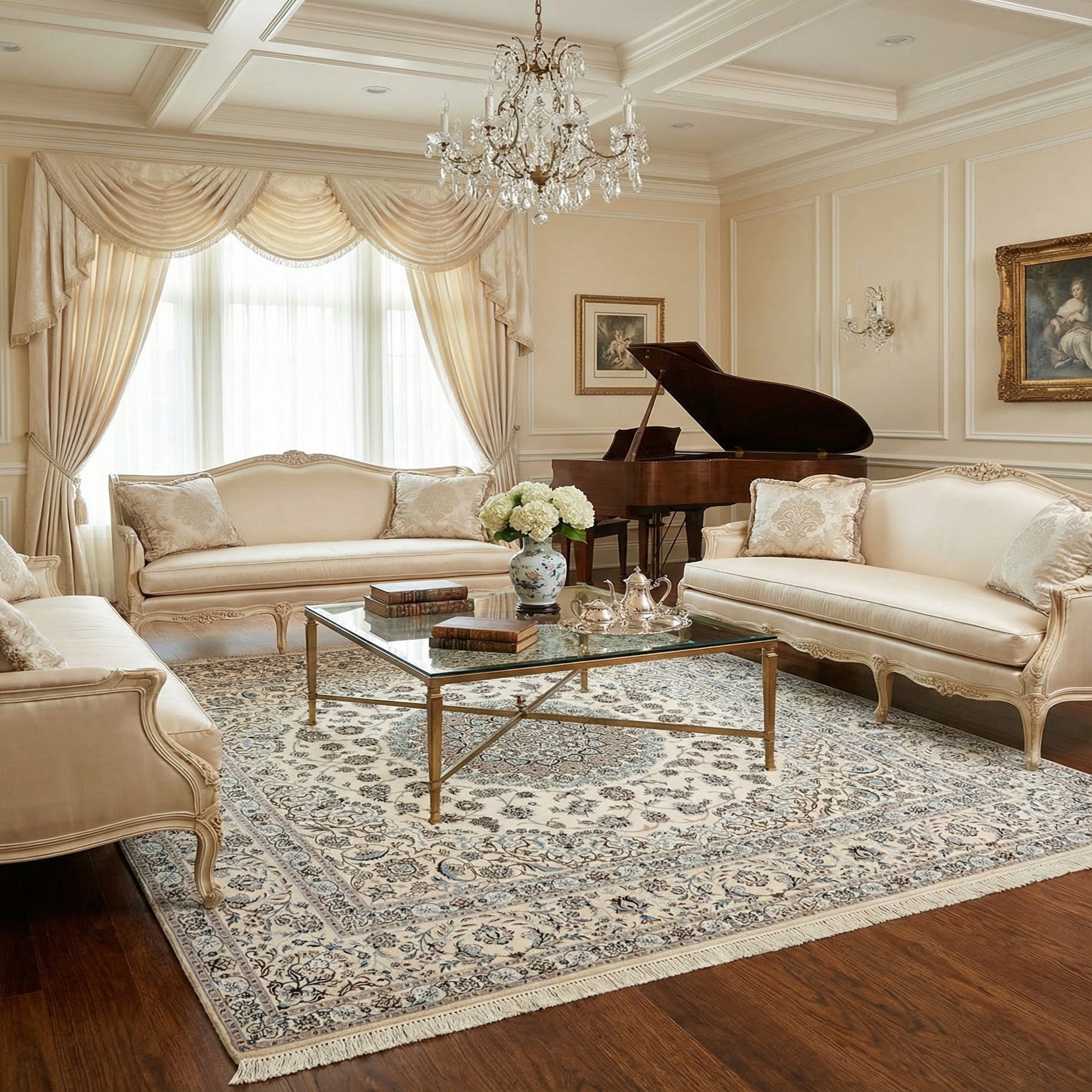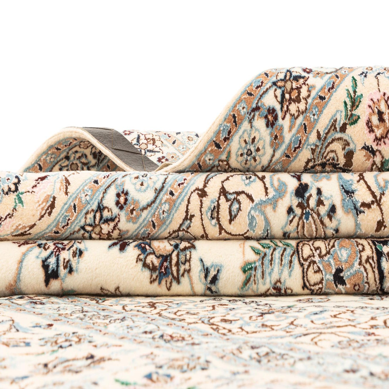 A handmade rectangular Persian rug in ivory and cream, featuring intricate floral and medallion patterns with blue and brown accents.