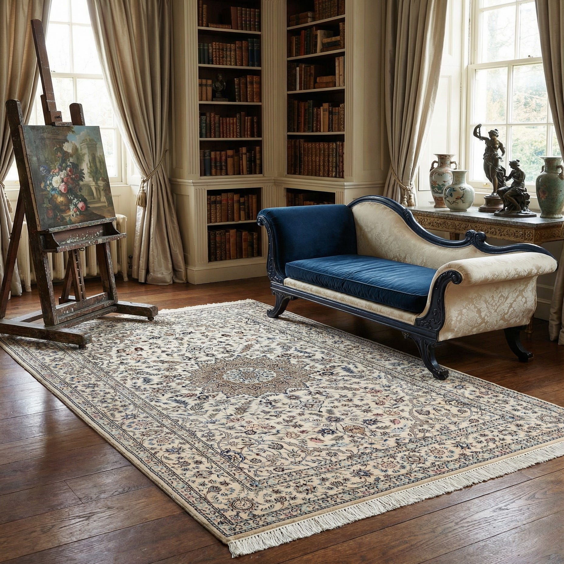 A classic central medallion anchors an array of delicate floral vines and scrolling arabesques on a soft cream background. Finely detailed borders frame the design, with tiny floral motifs and a subtle palette of navy, warm tan, muted rose and sage that contrast the cream field without overpowering it. The hand-knotted wool construction gives the pattern crisp definition and a low-to-medium pile that feels soft underfoot while holding its structure; short fringed ends complete the traditional look. This is a handmade, hand-knotted wool rug.