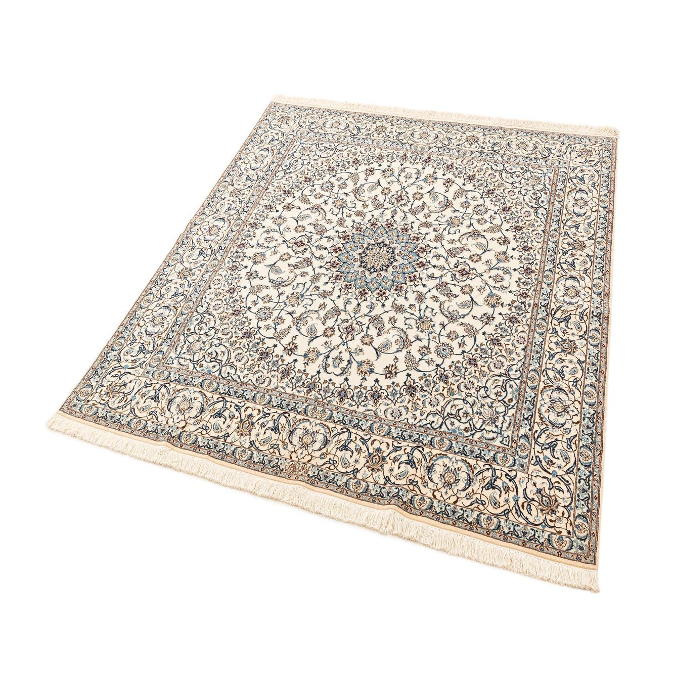 A finely detailed, traditional medallion design sits at the center of a luminous cream field, surrounded by an elegant network of scrolling vines and floral motifs and finished with multiple concentric borders and a short knotted fringe. The square format emphasizes symmetry and balance, while the hand-made, hand-knotted wool construction captures crisp knot work and a dense, smooth pile that feels soft underfoot and reveals the pattern with clear definition.