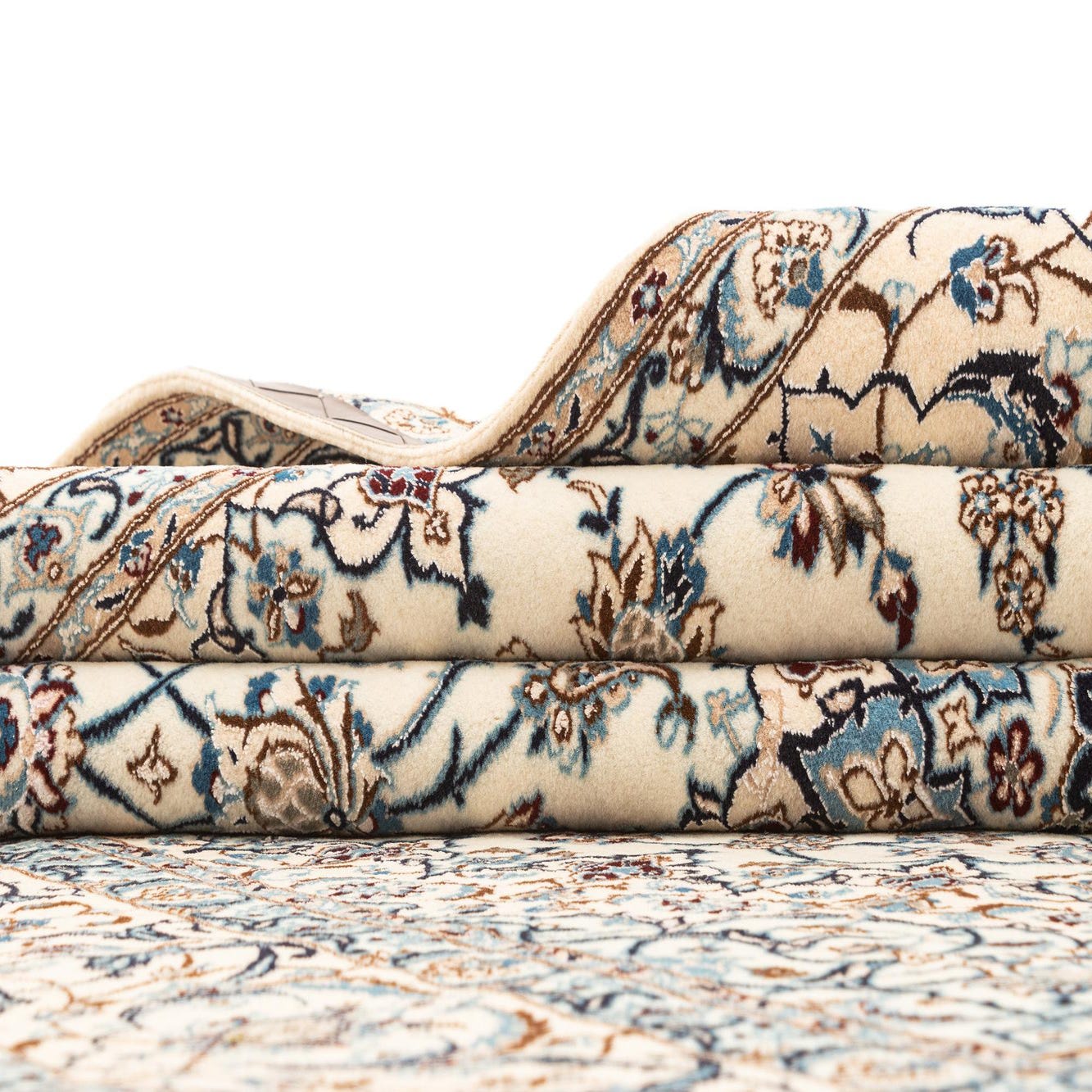Handmade rectangular Persian rug in ivory and cream with intricate blue and brown floral medallion patterns and fringe.