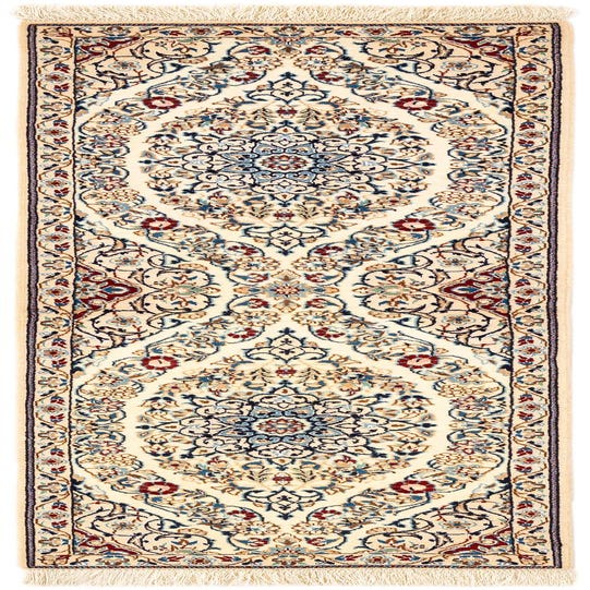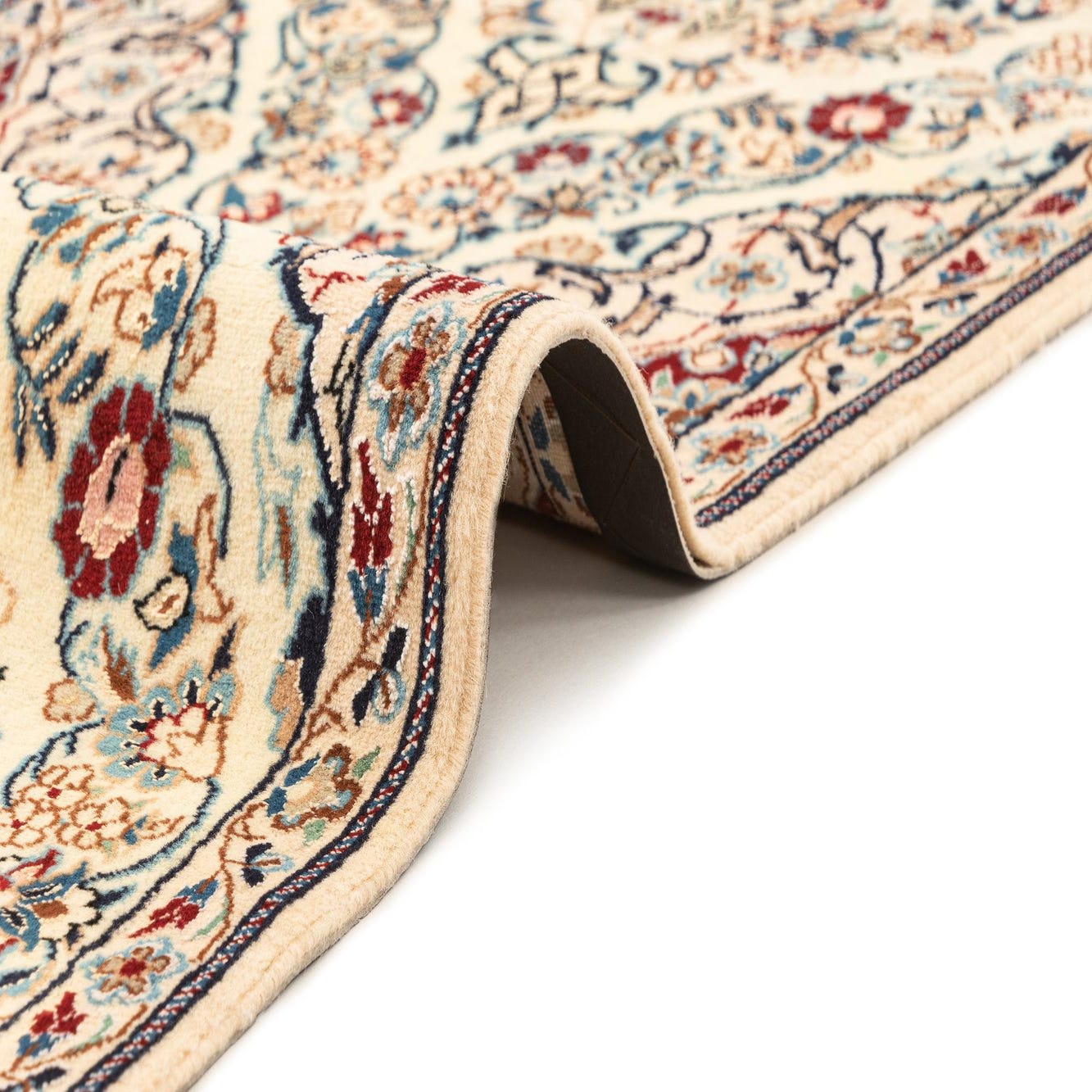 Handmade rectangular Persian rug in ivory and cream with intricate floral and medallion patterns in blue, red, and gold.