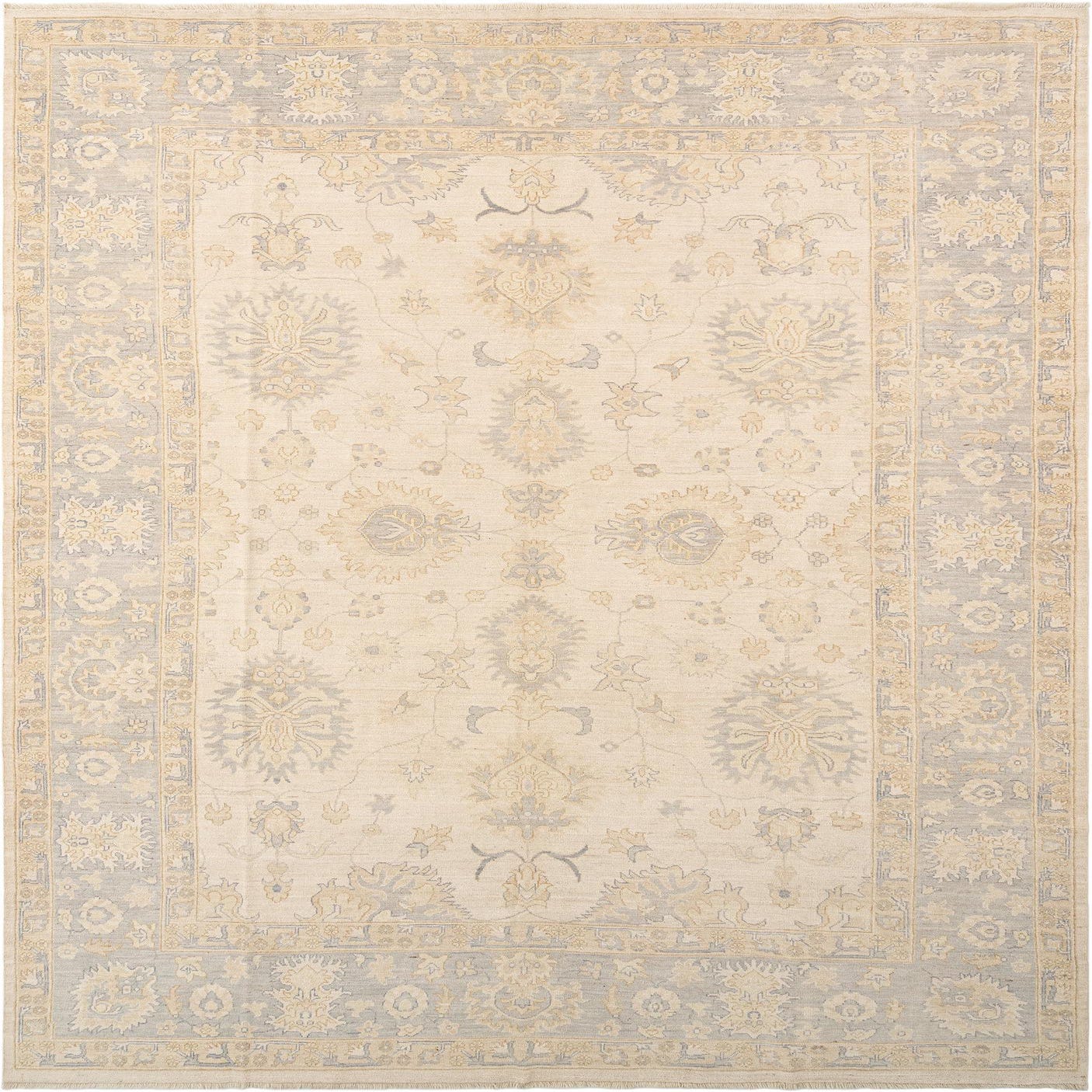 A rectangular Oushak Persian rug with an ivory field and light blue and gold floral patterns, featuring a detailed border.