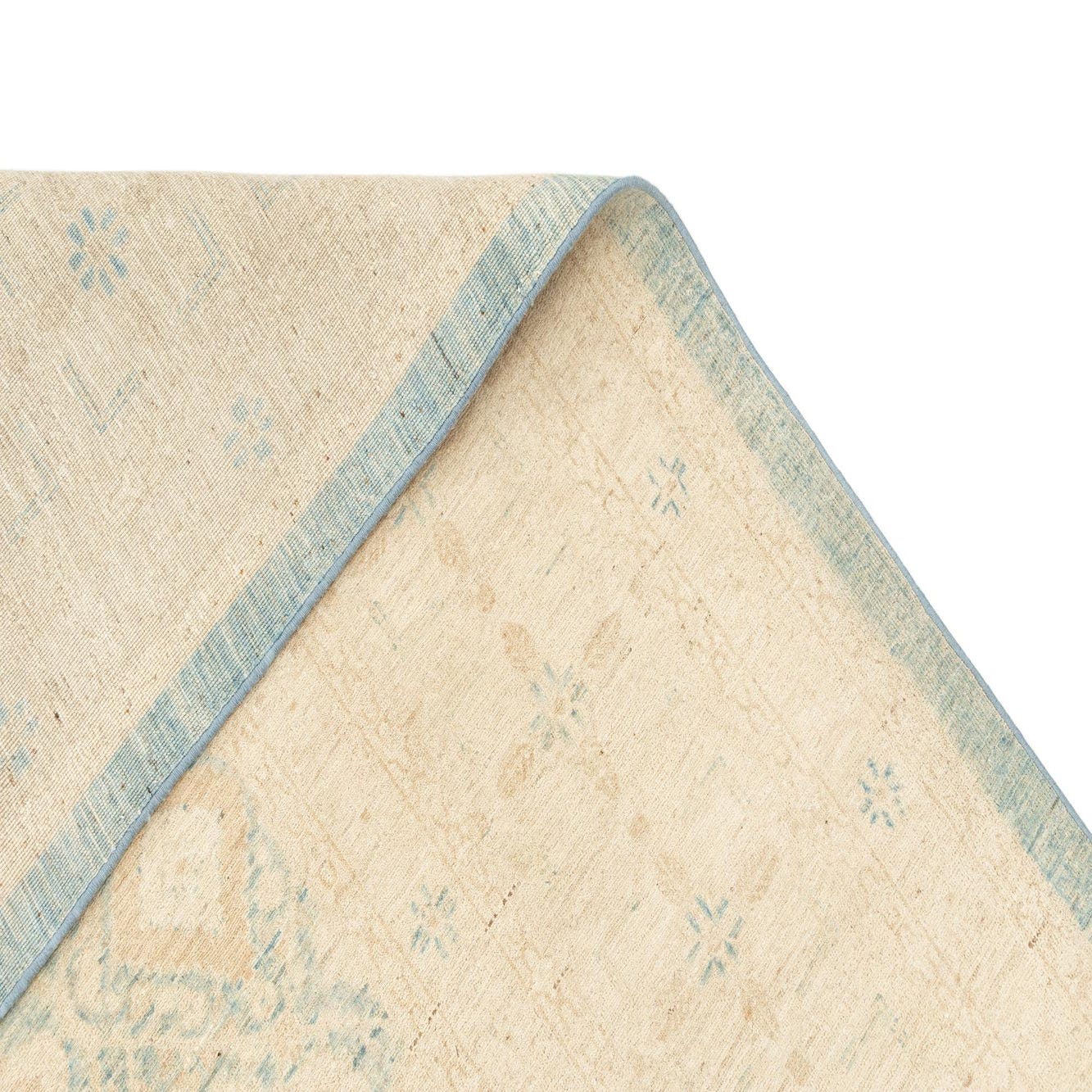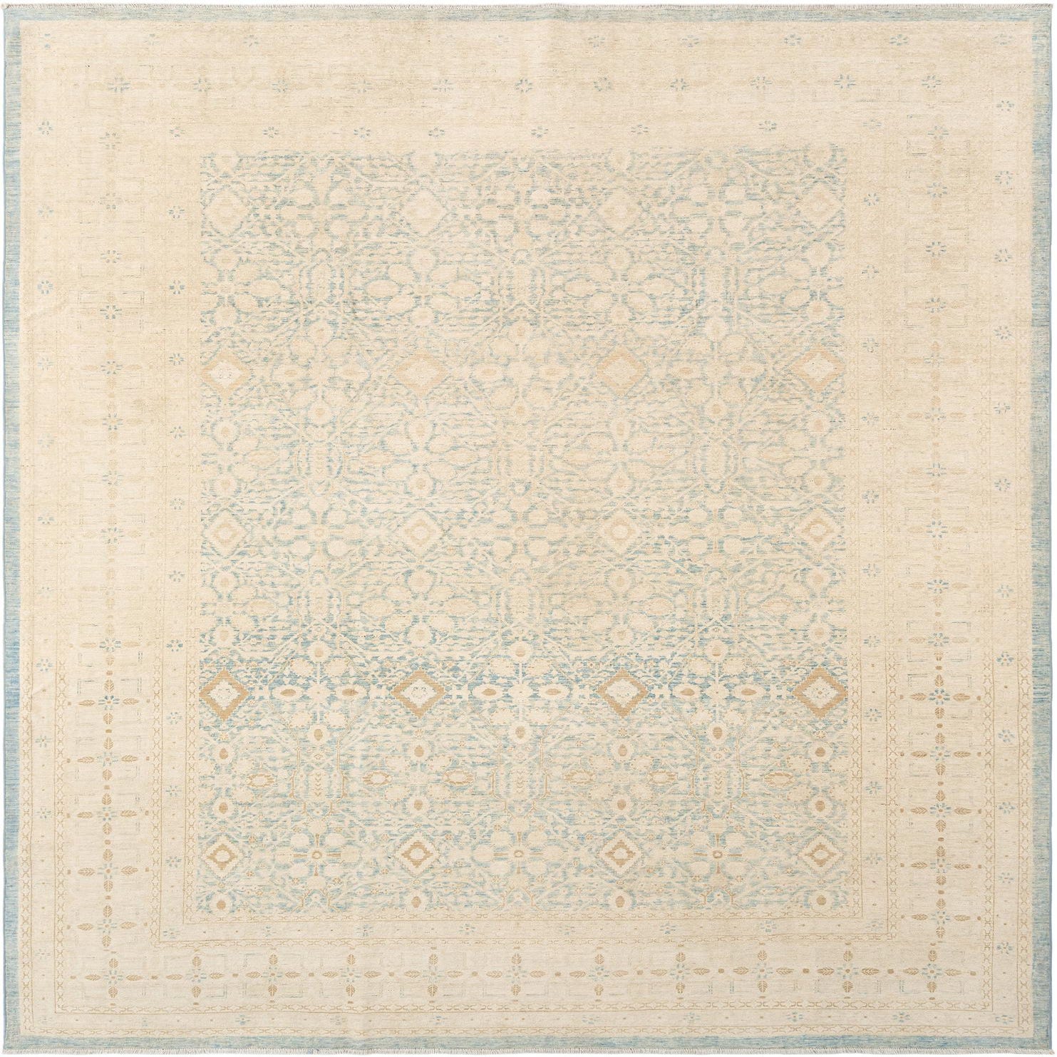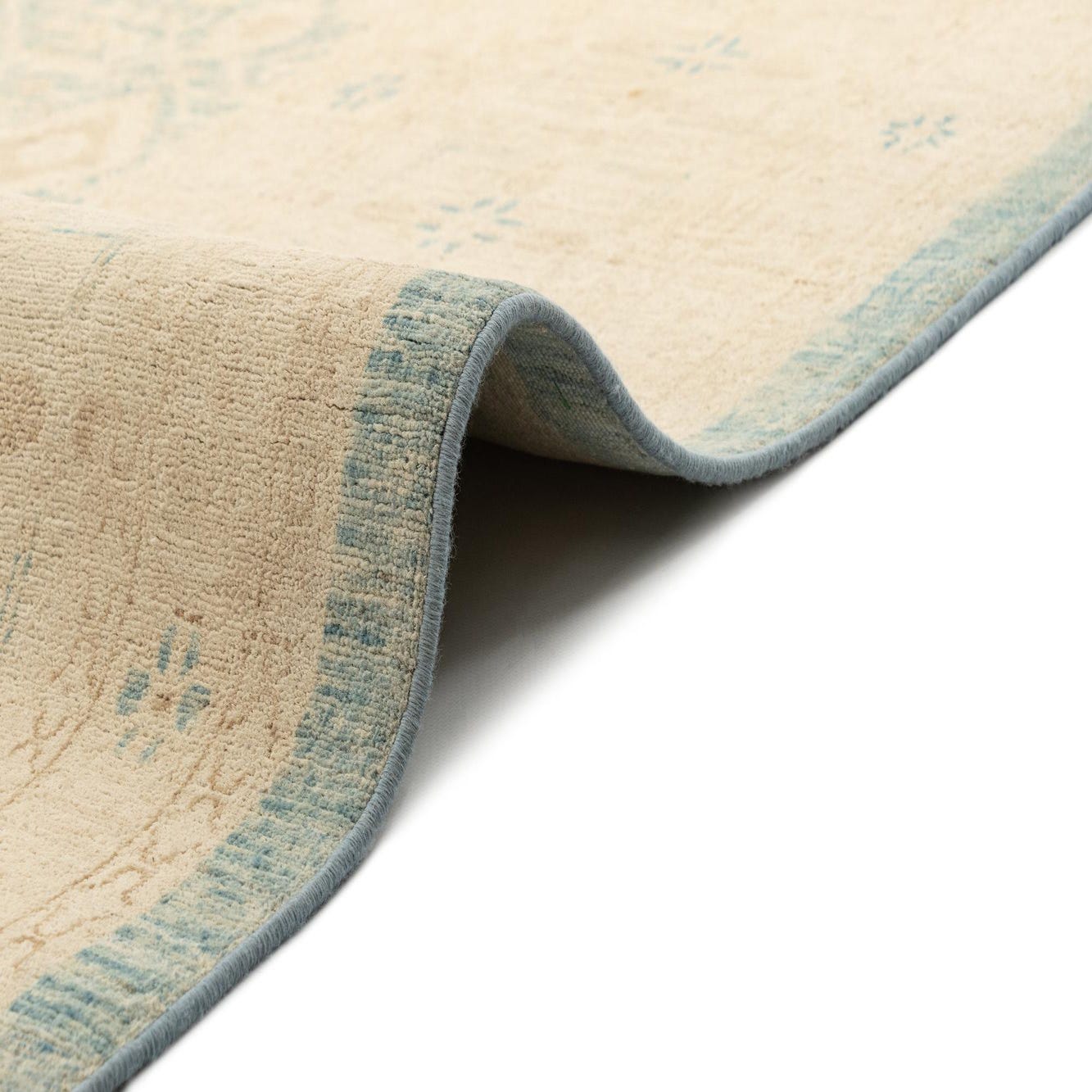 A rectangular handmade ivory and light blue Persian rug with an intricate floral and geometric pattern and a subtle border.