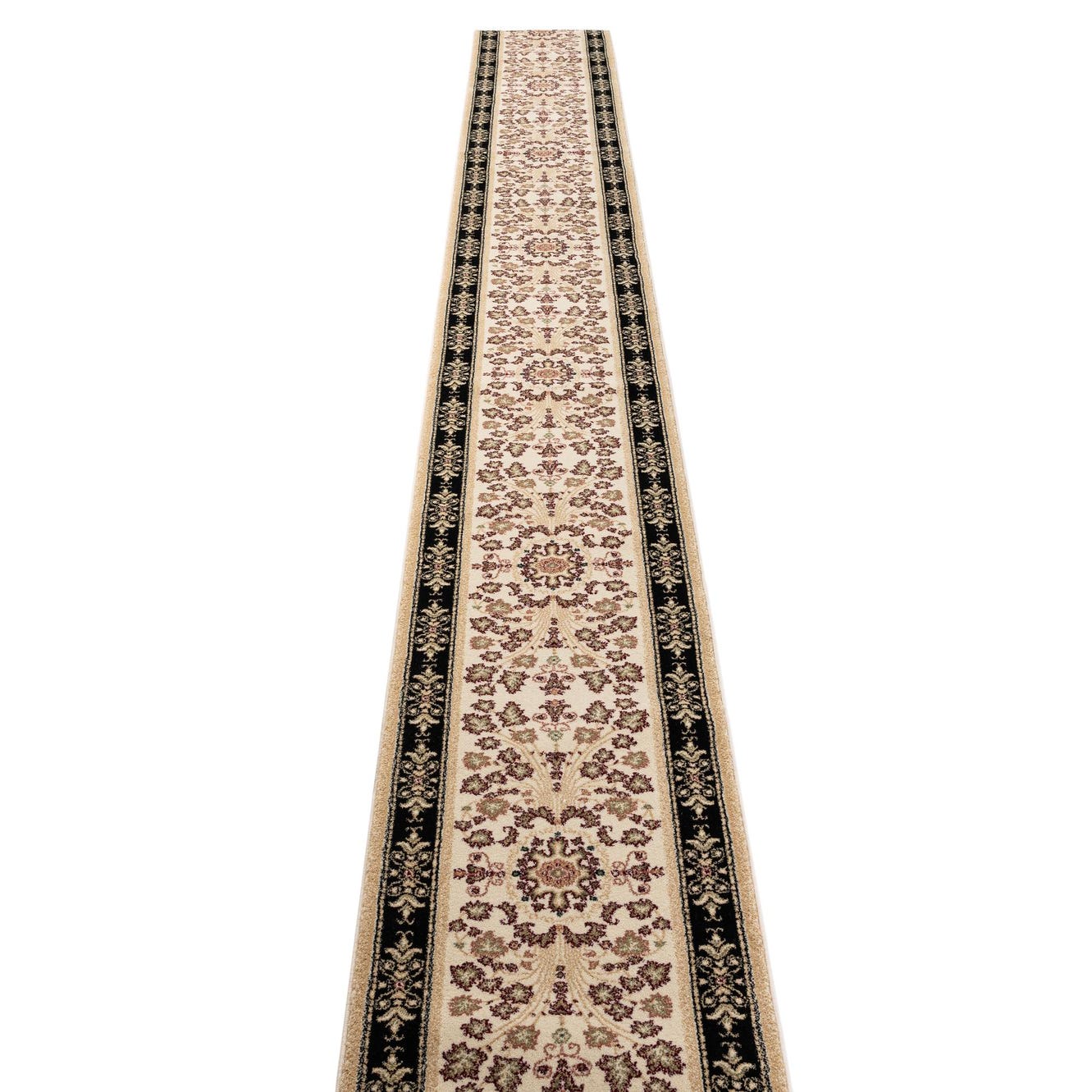 A long, rectangular ivory and cream runner rug with a traditional floral pattern in brown and black, featuring ornate borders.