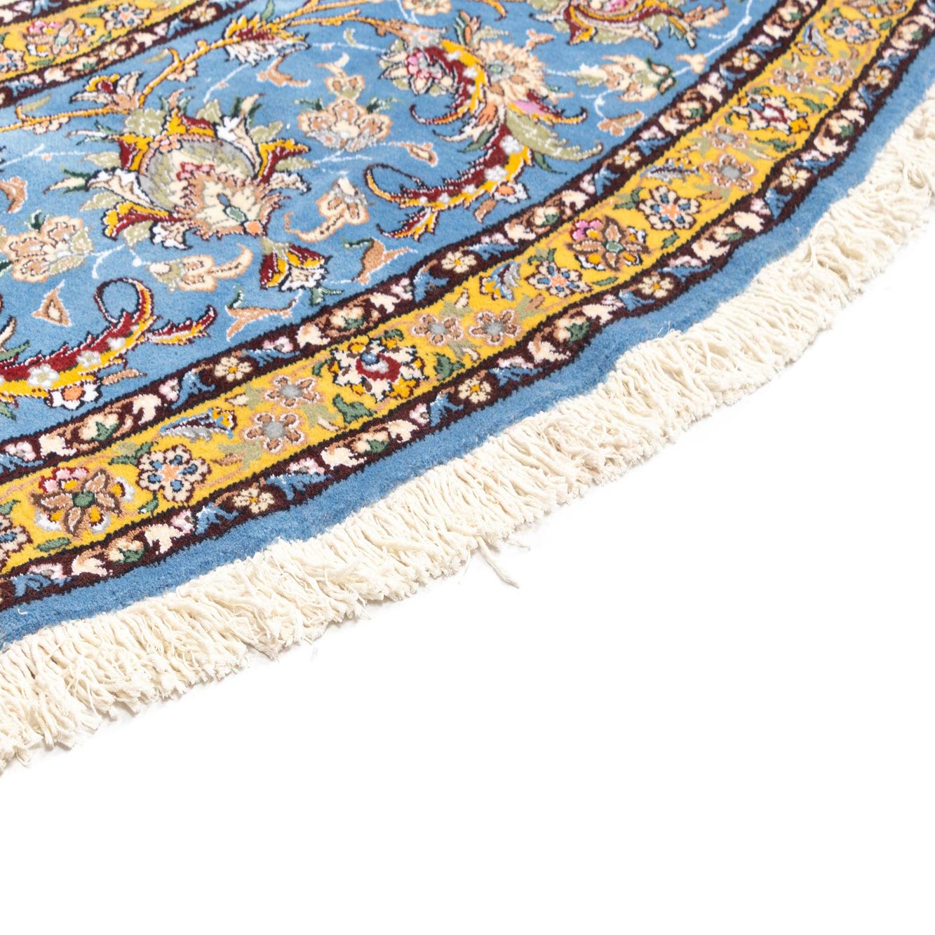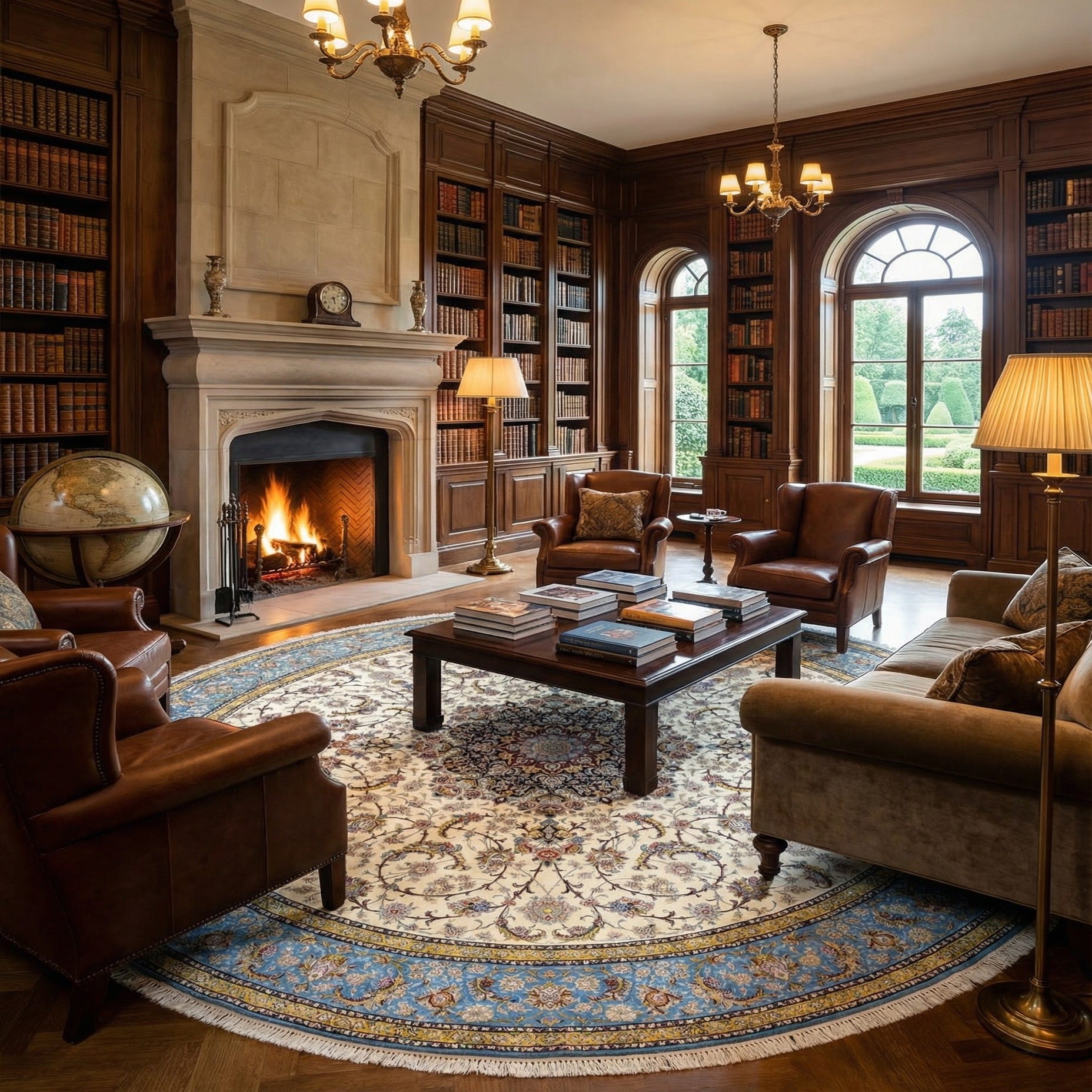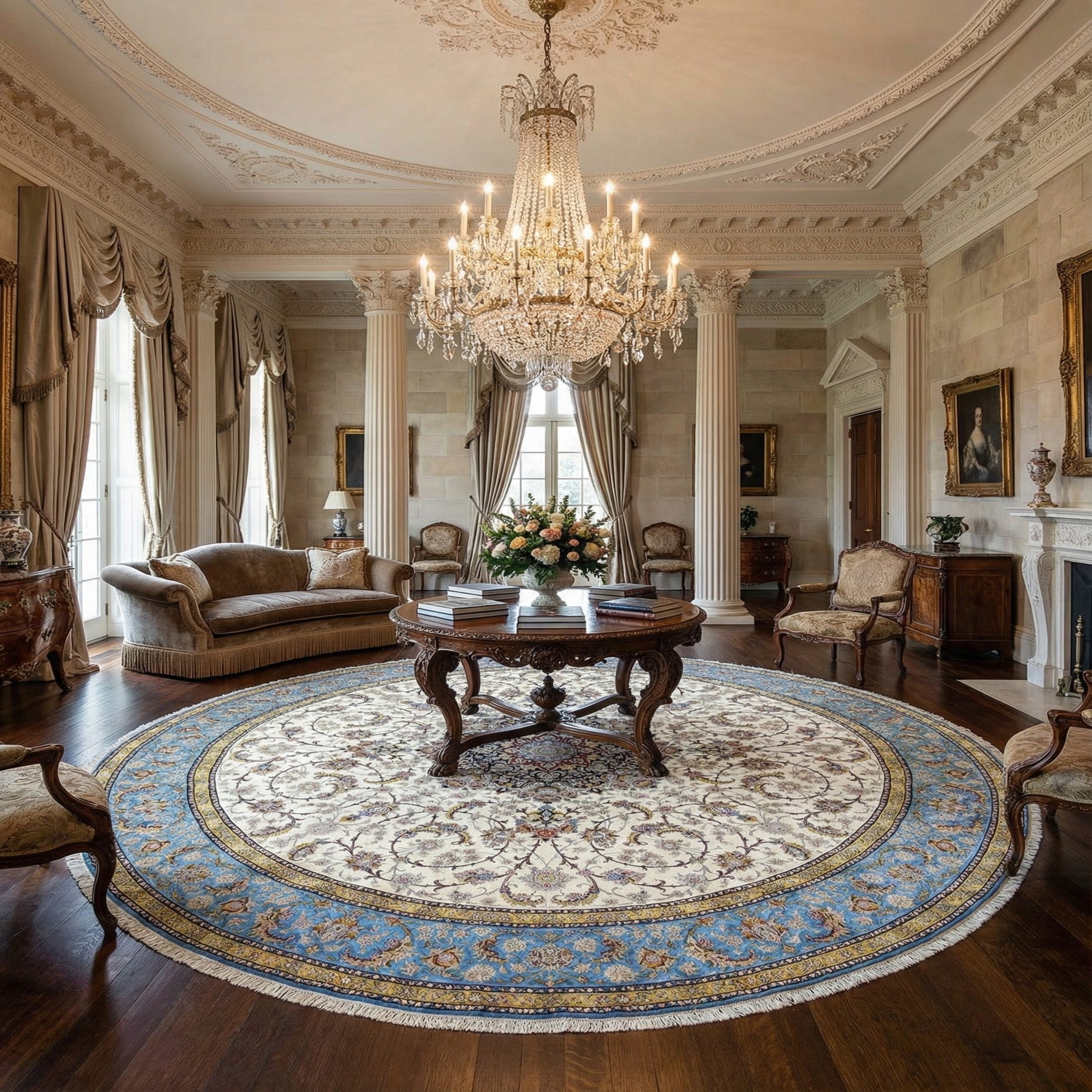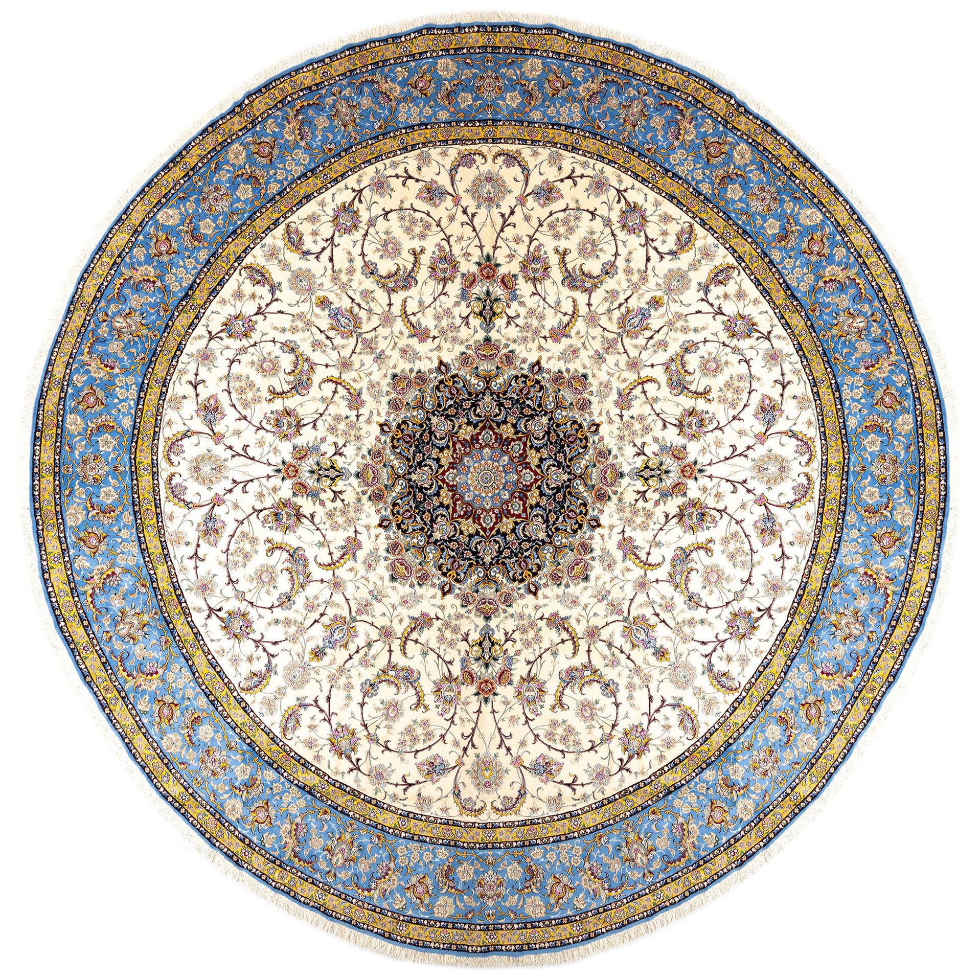 A large round ivory Persian rug with intricate floral motifs in blue, gold, and red, featuring a prominent central medallion and a wide blue border.