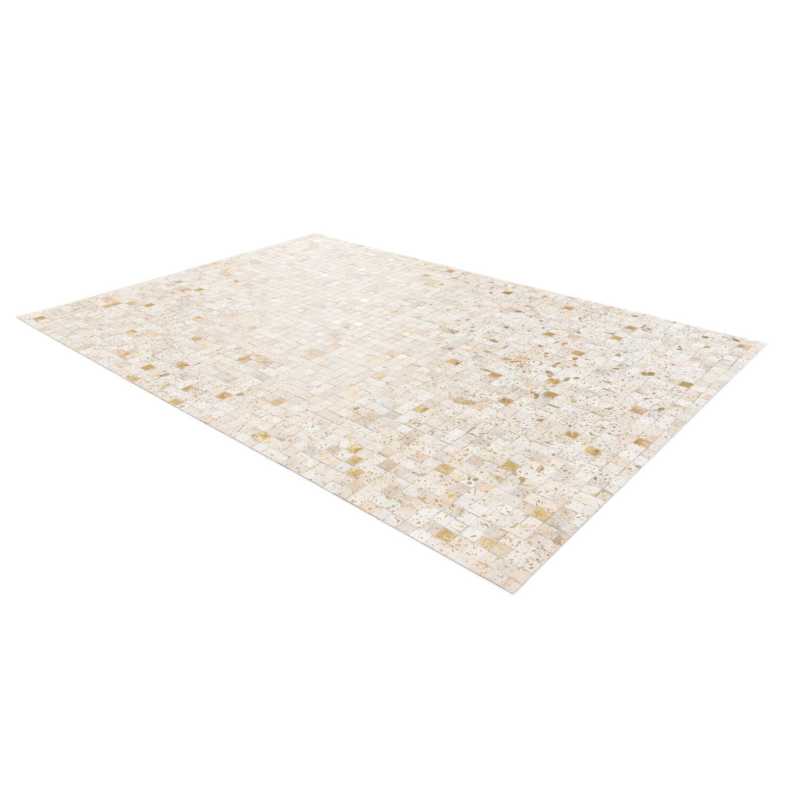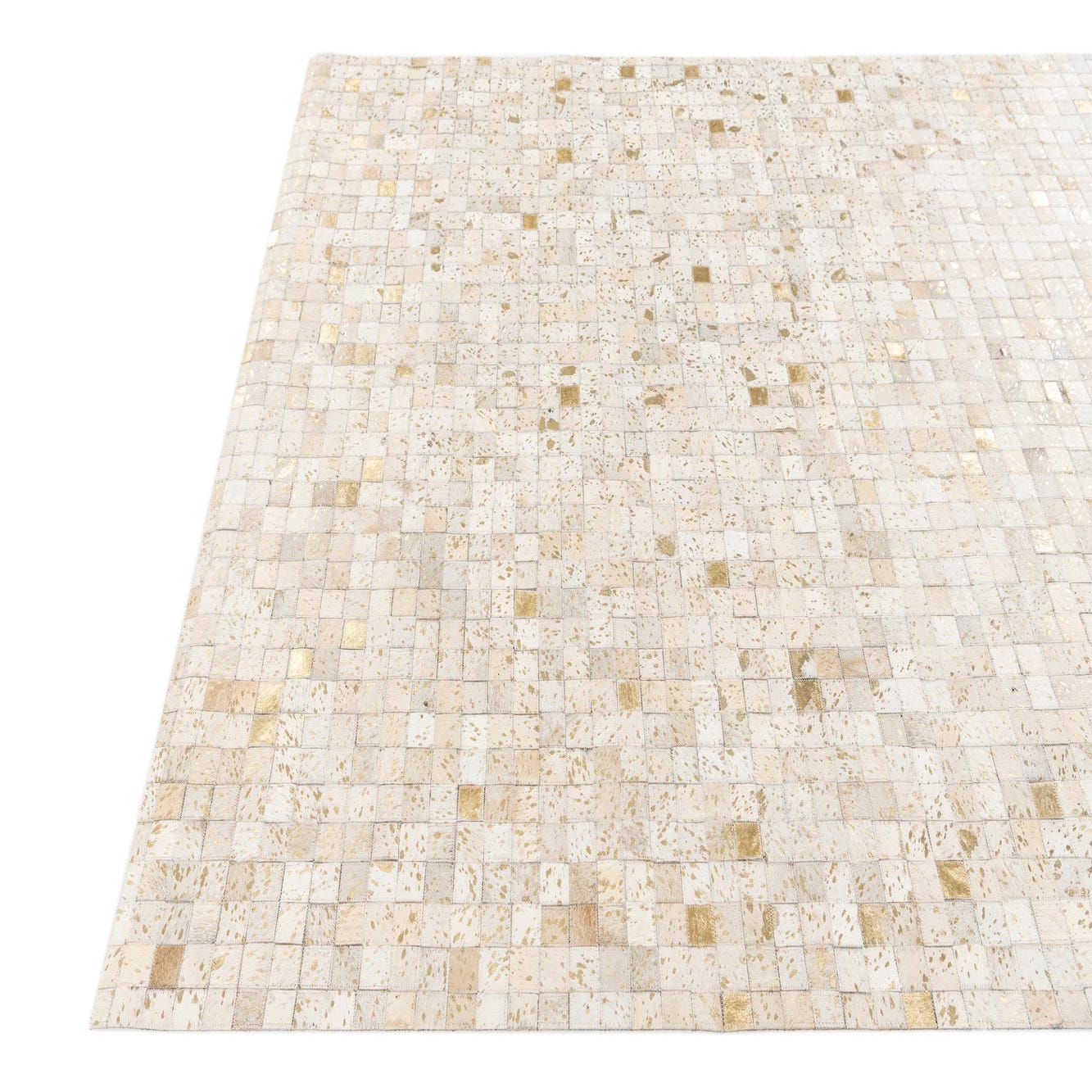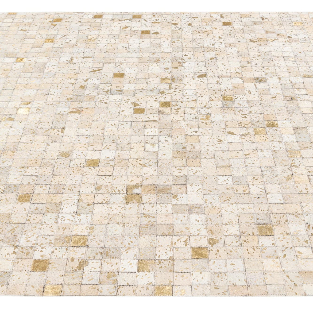 A rectangular 5x7 modern rug featuring a mosaic of small square cowhide and leather tiles in varying shades of cream, beige, and gold.