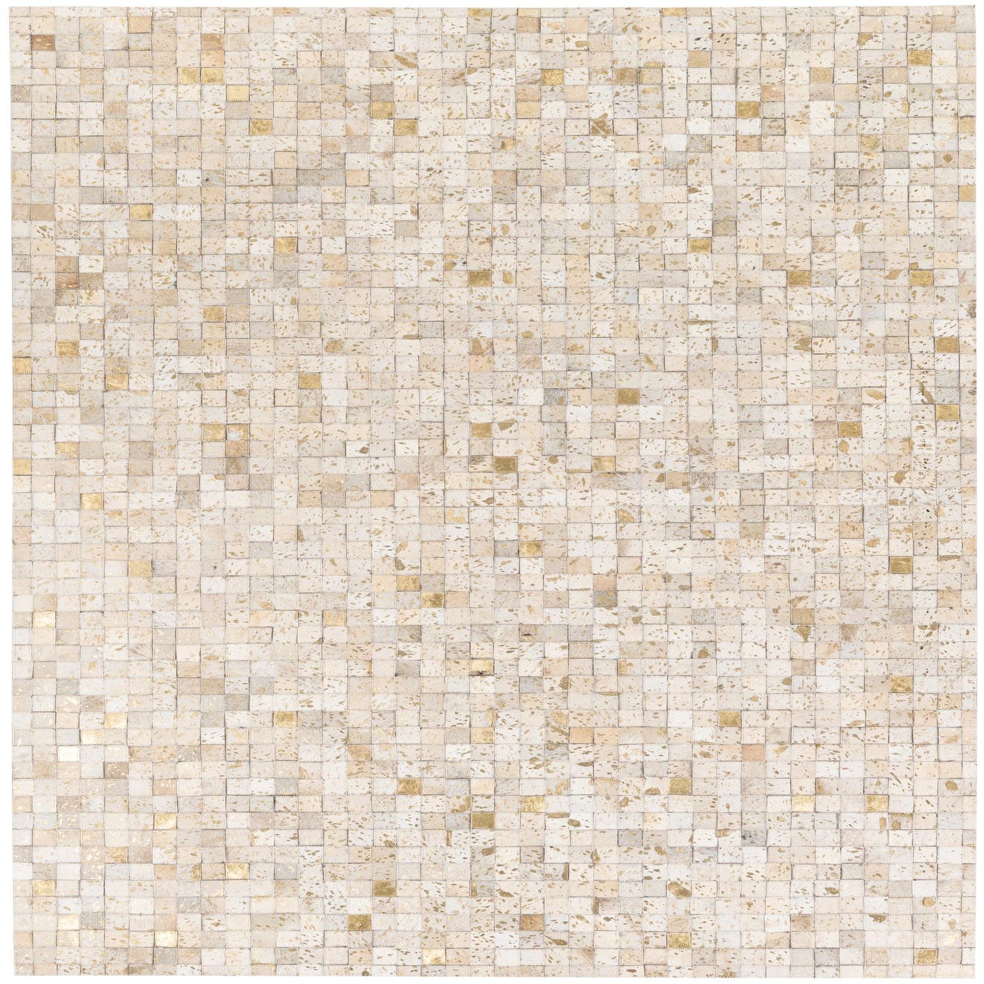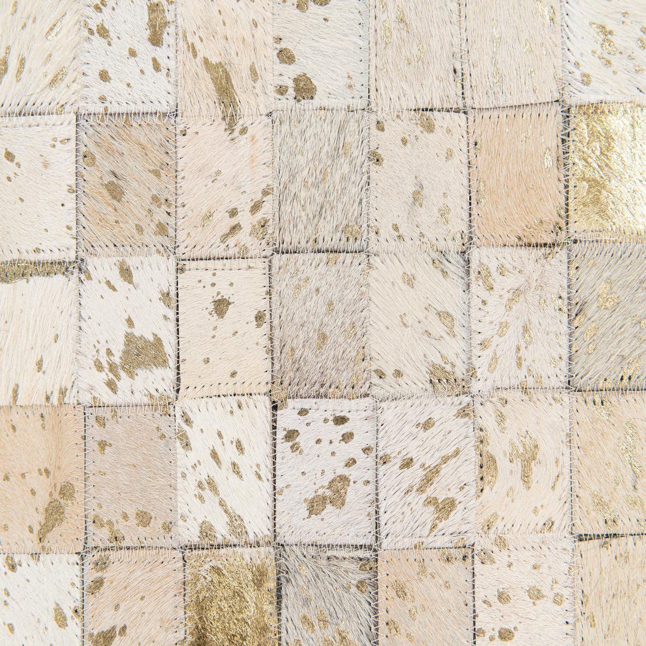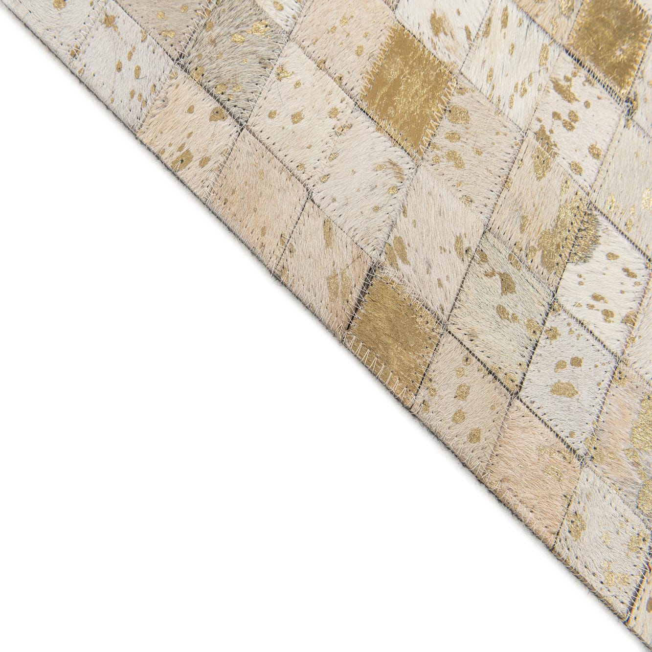 A rectangular 5x7 modern rug featuring a mosaic of small square cowhide and leather tiles in varying shades of cream, beige, and gold.